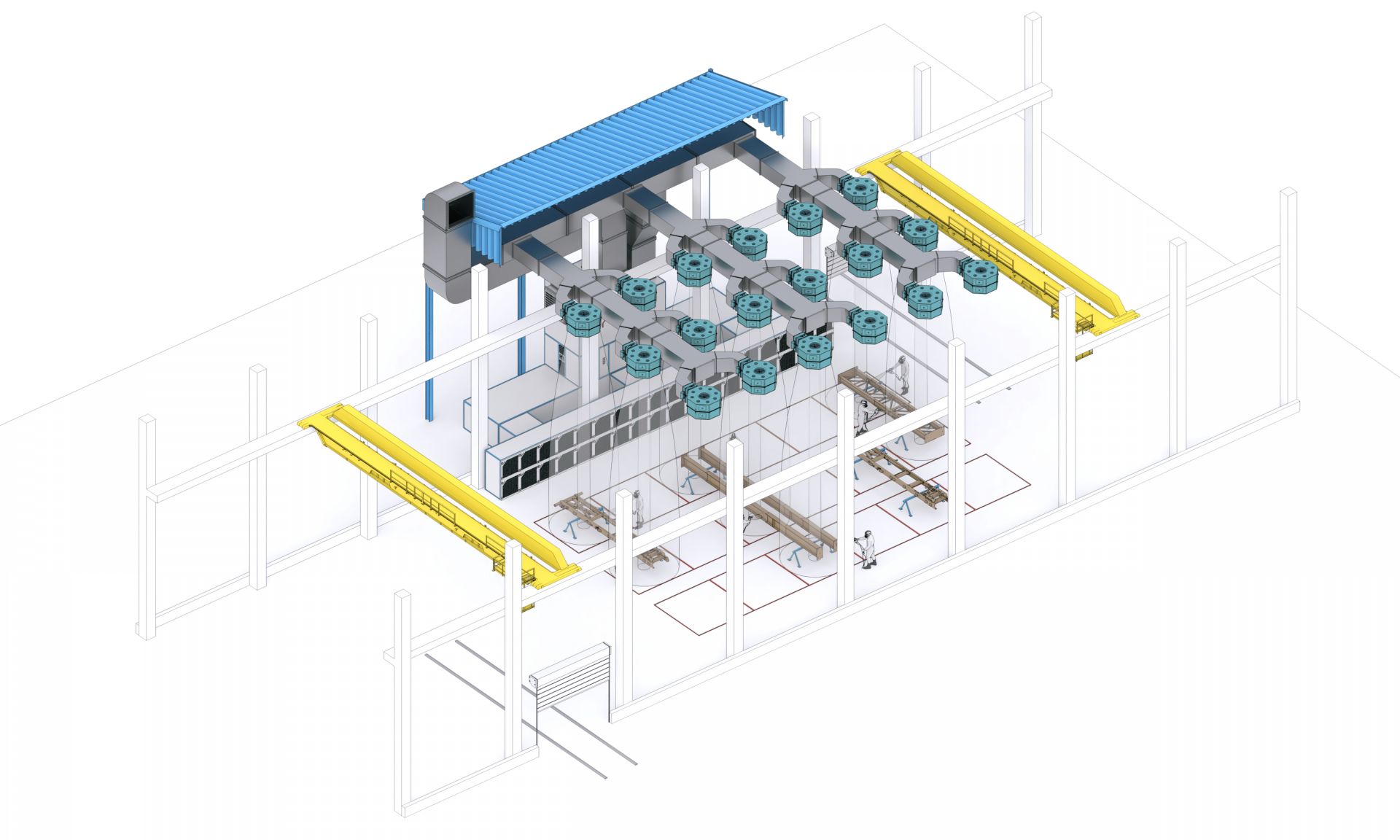 Зона открытой окраски — это комплекс специализированного оборудования и системы вентиляции, разработанных для проведения покрасочных работ как в существующих, так и в новых цеховых помещениях. Такой подход исключает необходимость возведения дополнительных ограждающих конструкций и транспортных систем, что делает его одним из наиболее современных и быстрых способов организации промышленной окраски.