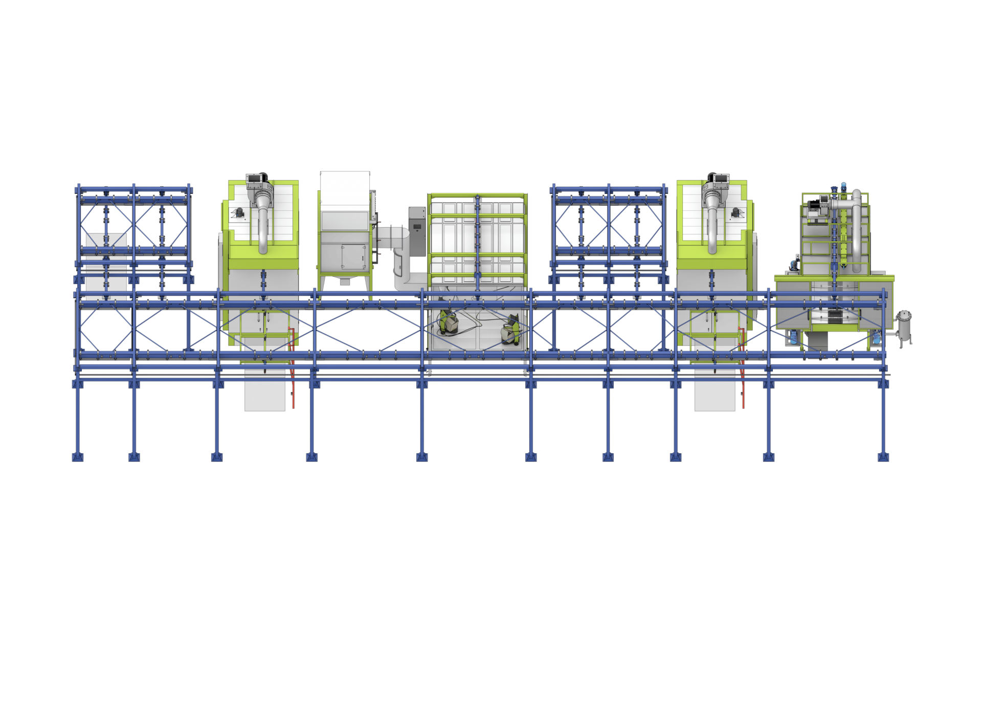 Агрегат для химической обработки поверхности: представляет собой туннельную струйную камеру, через которую на подвесных конвейерах перемещаются изделия. На входе расположены двери для предотвращения утечек. Перемещение траверс управляется электроприводом. Корпус выполнен из сборных элементов со сварными соединениями; внутренняя часть и ванны сделаны из нержавеющей стали.