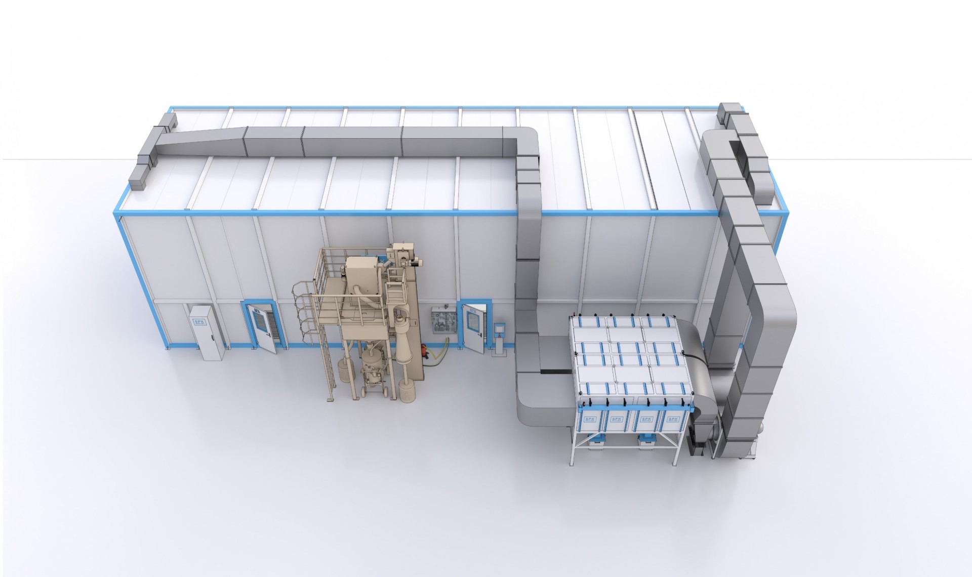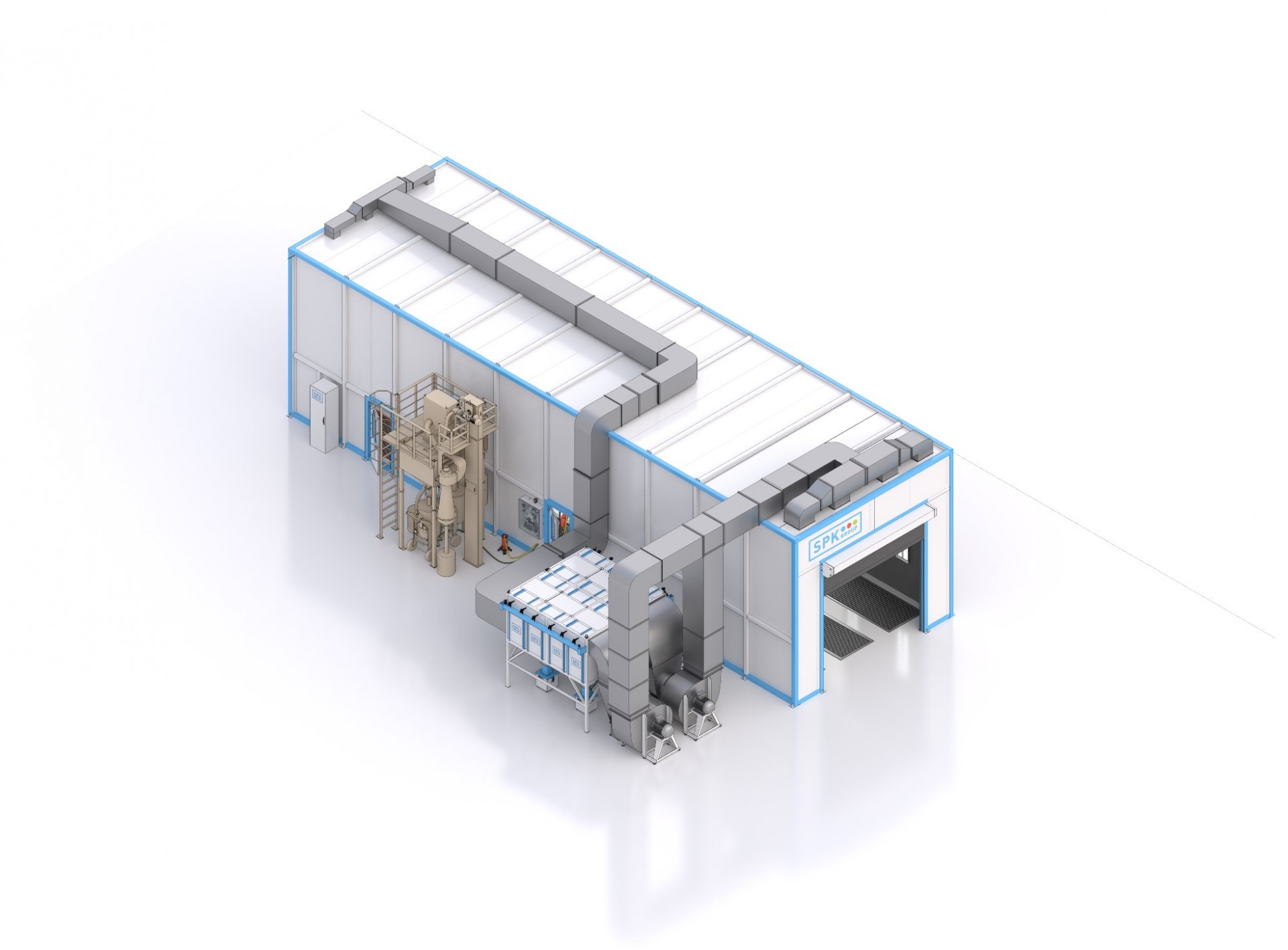 Вытяжные отбойные щиты находятся в стене дробеструйной камеры и предназначены для эффективного удаления загрязнённого воздуха. Вентиляционная система включает металлический корпус, вентилятор, пневмоаккумулятор, фильтры, резервуар для пыли и автоматическую систему очистки сжатым воздухом. Корпус имеет все необходимые отверстия для обслуживания и инспекции. Фильтрующие патроны очищаются автоматически с помощью впрыска сжатого воздуха, а датчики давления контролируют загрязнение фильтров. Такой фильтрационный блок отличается компактностью и высокой эффективностью очистки, при этом пылевыделение минимально.