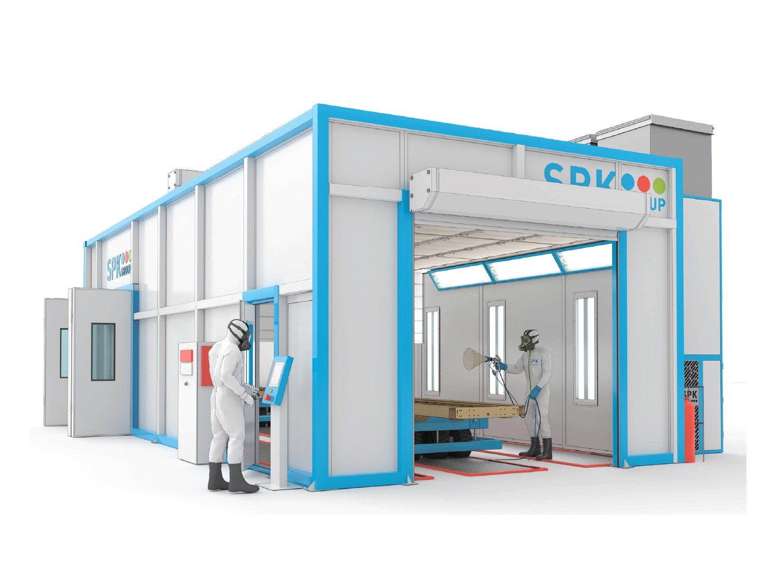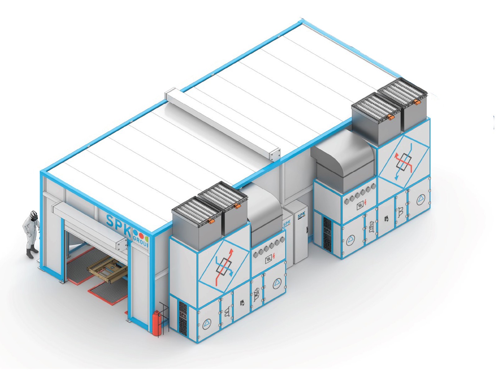 Двухсекционная тупиковая окрасочно-сушильная камера SPK-SCB-12.5.3 предназначена для подготовки поверхностей, нанесения лакокрасочных покрытий методом безвоздушного распыления и дальнейшей сушки различных изделий. Общая потребляемая мощность системы — 63 кВт, включая вентиляторы, освещение, ворота, вентилятор компрессора и управляющий шкаф. При температуре наружного воздуха -23°C потребление нагревательных секций достигает примерно 228 кВт.