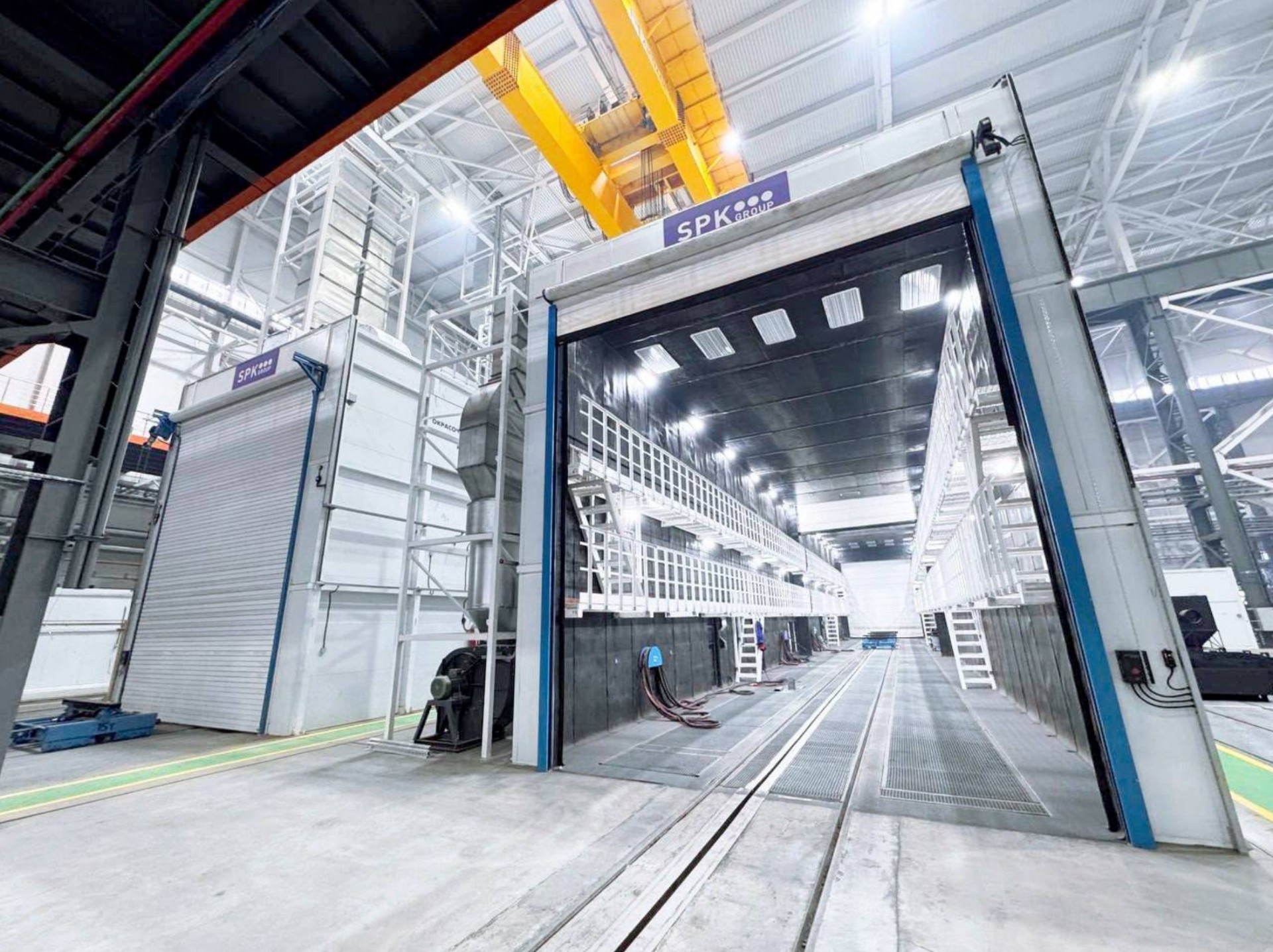 Обратите внимание на этого Атланта — двухсекционную дробеструйную камеру проходного типа, которая является частью окрасочной линии компании SPK GROUP для «Механоремонтного комплекса».