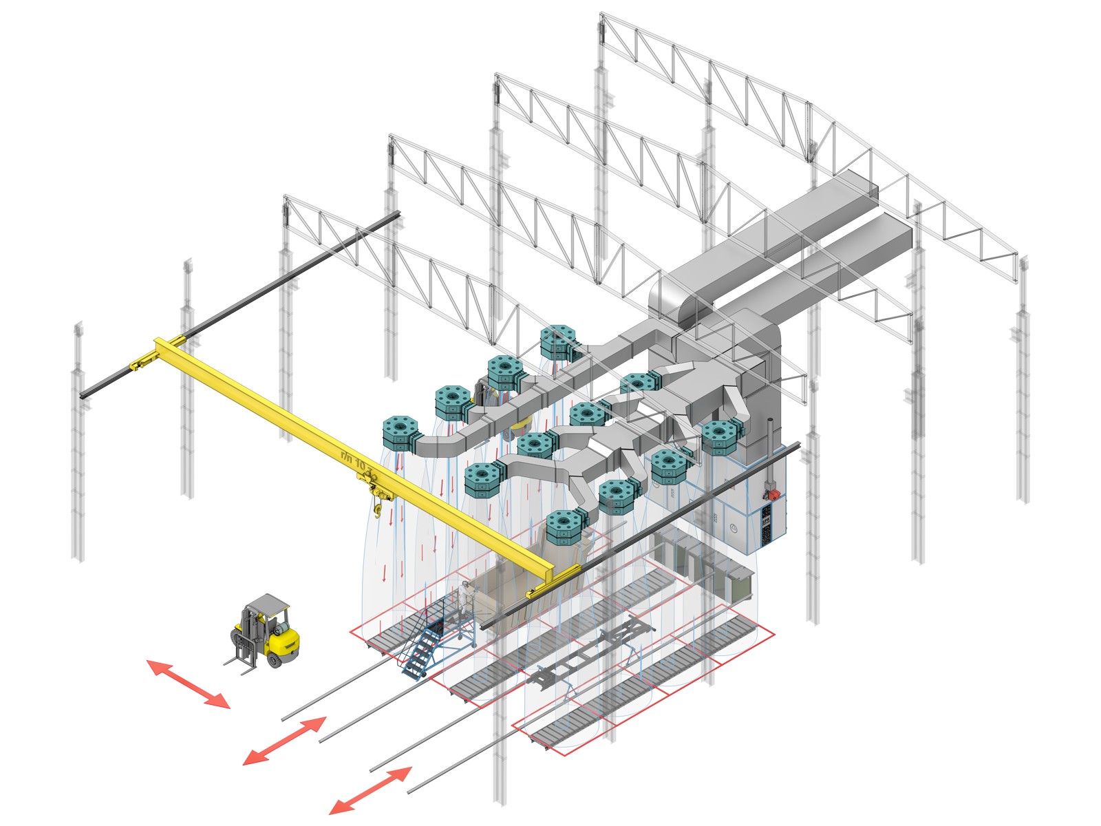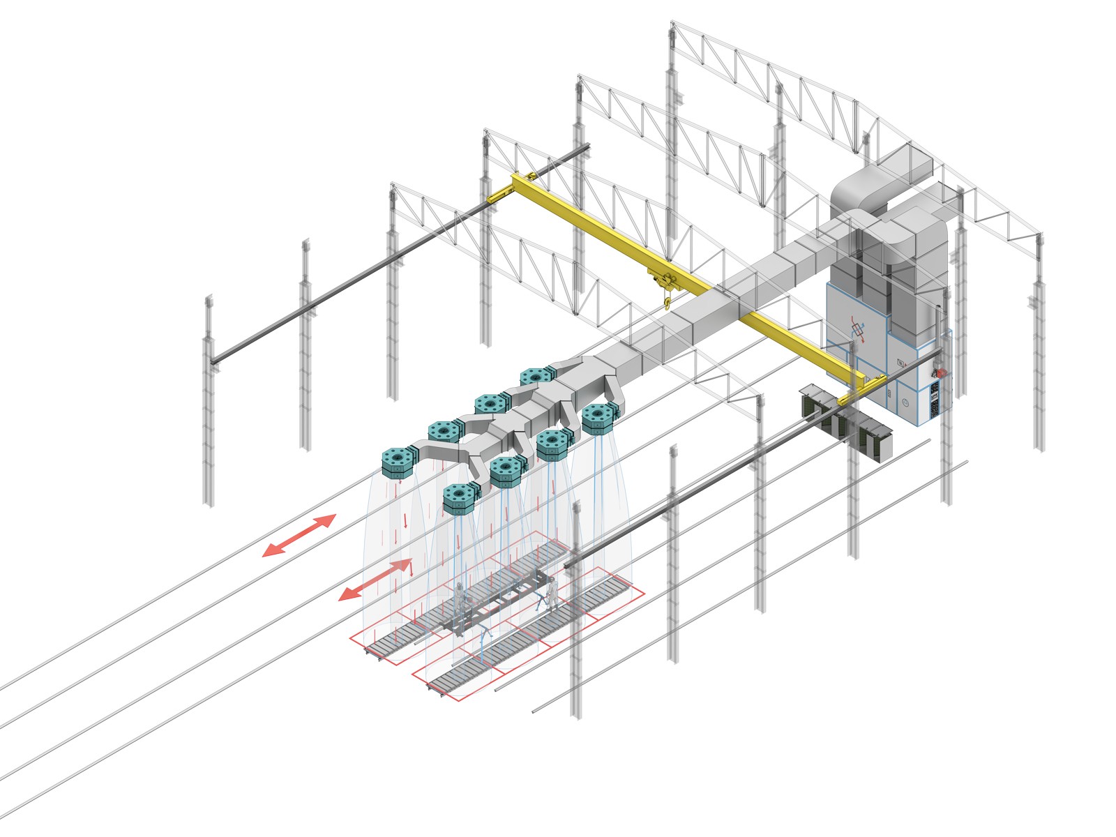 Приточный воздух от вентиляционного агрегата по воздуховодам поступает через открытые клапаны в дальнобойные сопла, расположенные под потолком. Формируемый воздушный поток направляется вертикально вниз, способствуя эффективному сбиванию окрасочного тумана в зоне окраски.