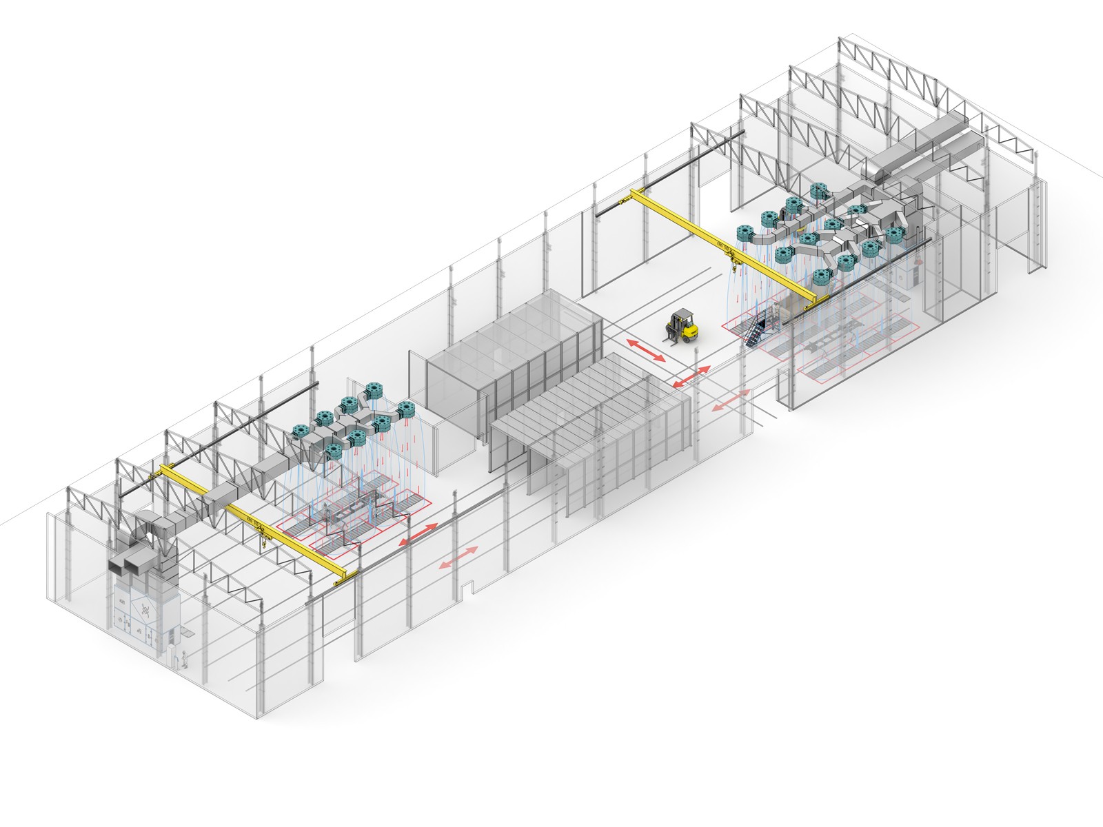 Заказчик обязуется поддерживать температуру внутри цеха в холодный период не ниже +18…+22°С, что необходимо для подачи приточного воздуха технологической вентиляции с аналогичной температурой. Все инженерные коммуникации в зоне установки оборудования должны быть демонтированы или перенесены.