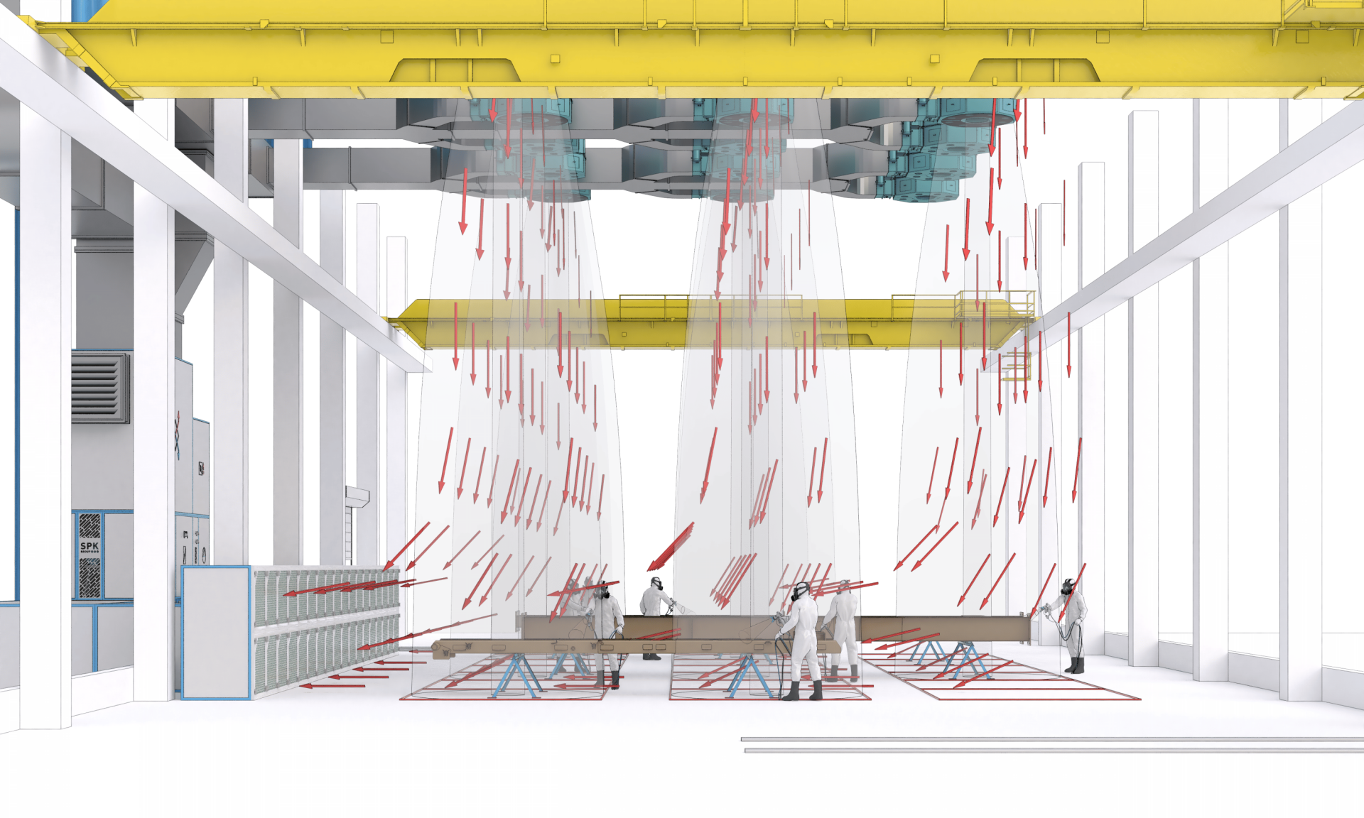 Зона открытой окраски — это комплекс специализированного оборудования и системы вентиляции, разработанных для проведения покрасочных работ как в существующих, так и в новых цеховых помещениях. Такой подход исключает необходимость возведения дополнительных ограждающих конструкций и транспортных систем, что делает его одним из наиболее современных и быстрых способов организации промышленной окраски.
