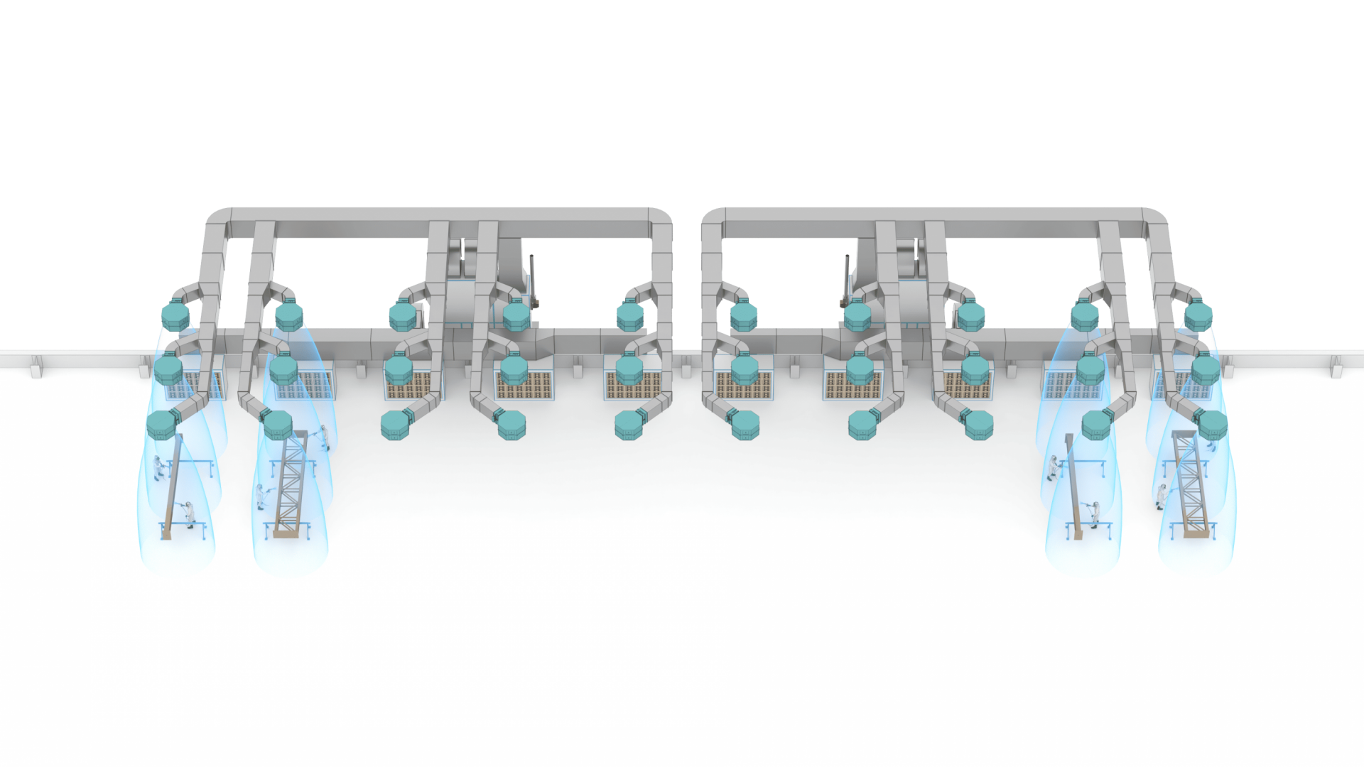 Саму зону используют для безопасного окрашивания изделий внутри участка, причем детали размещают под группой воздушных сопел, позволяя окраску с любой стороны и создавая условия для прокачки стремянок и свободного прохода персонала. В системе применяются двухпоточные направленные сопла с воздушными клапанами для регулировки и отключения потока, всего — около 30 пневмоприводных клапанов.