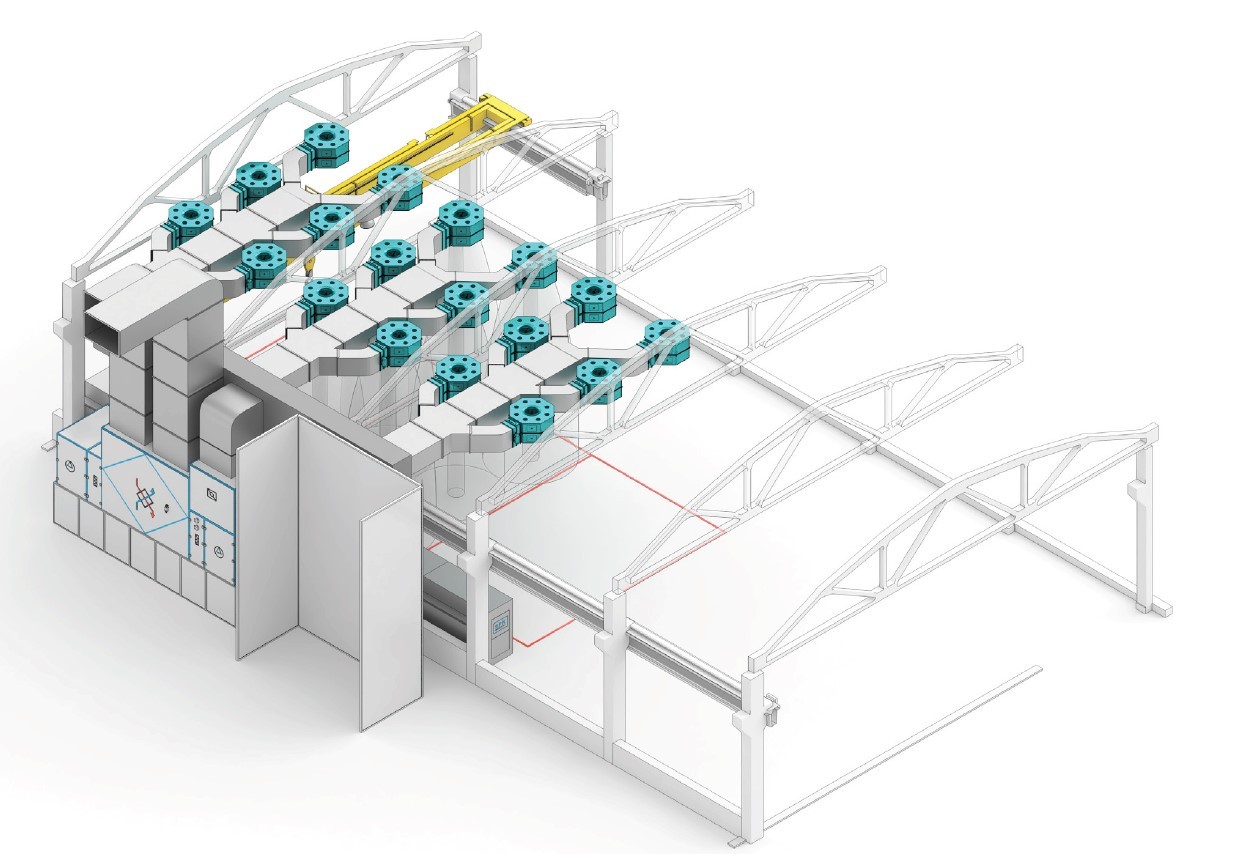 Принцип работы зоны открытой окраски Зона SPK-OPSS-18.9 делится на отдельные участки, чтобы повысить энергоэффективность — в работу одновременно включается только тот участок, где ведется окраска. На каждом участке работает от 4 до 10 сопел. Изделия поднимаются на подставки с помощью крана или тельфера, после чего операторы подготавливают их к окрашиванию и распыляют лакокрасочные материалы. Во время нанесения операторы выбирают на пульте группу сопел, расположенных над конкретным участком изделия. Система автоматически открывает клапаны для подачи и отвода воздуха. Для равномерного распределения воздуха в приточной части зоны установлены двухпоточные воздухораспределительные сопла, закрепленные под потолком и соединенные с вентагрегатом воздуховодами.