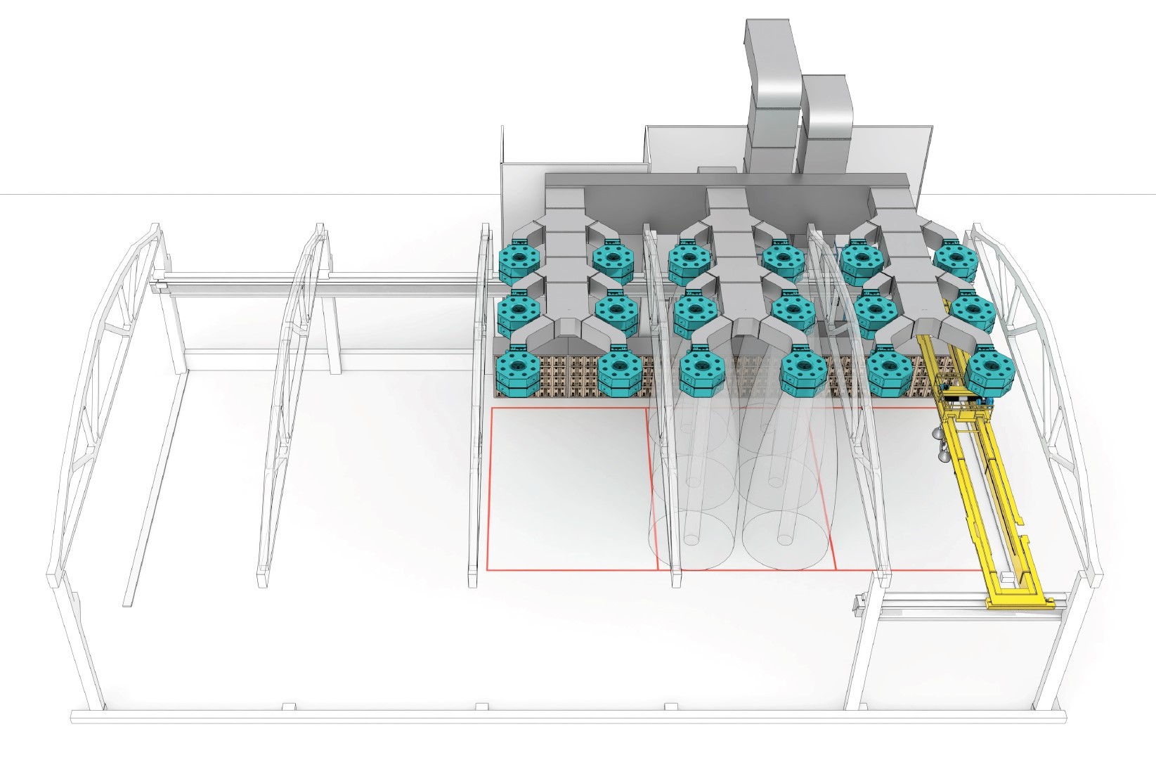 Зона открытой окраски (ЗОО) предназначена для безопасного нанесения покрытий на изделия в пространстве площадью 18х9 метров (162 м²). В этой области изделия размещаются под группой воздушных сопел, что позволяет окрашивать их со всех сторон, а также обеспечивает проезд для стремянок и свободный проход для персонала.