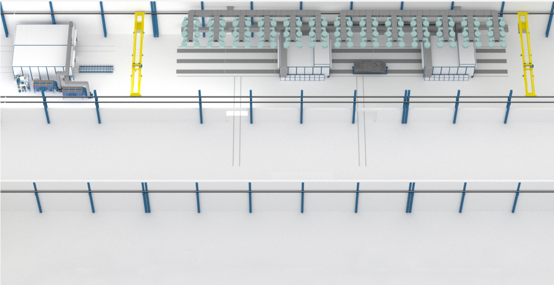 Зона открытой окраски SPK-OPSS-45.9.10 включает в себя 45 направленных сопел с клапанами, а также столько же пневматических отсекных клапанов лабиринтного пола. В комплект входят одна секция механического фильтра G2 и две кассетные секции для рулонного «краскоостанавливающего» фильтра, которые включают стекловолоконные фильтры G3. Для вентиляции установлены два агрегата приточно-вытяжной системы SPK-VU-50 с искробезопасным исполнением, вырабатывающие по 50 000 м³/час воздух each. Также в комплектацию входят два газовых теплообменника с горелками и мультиблоками, а также два пластинчатых рекуператора тепла. На воздуховодах размещены четыре воздушных отсекающих клапана. В системе задействованы шкаф управления, пневмо-распределительный шкаф и сенсорная панель для контроля. Электрические кабели и пневматические линии идут с шкафа к потребителям. В документации представлены разделы КЖ (фундамент), ОВ (воздуховоды), а также электрические и пневматические принципиальные схемы и план подключения энергоисточников. В комплект входят паспорт, руководство по эксплуатации и сертификат.