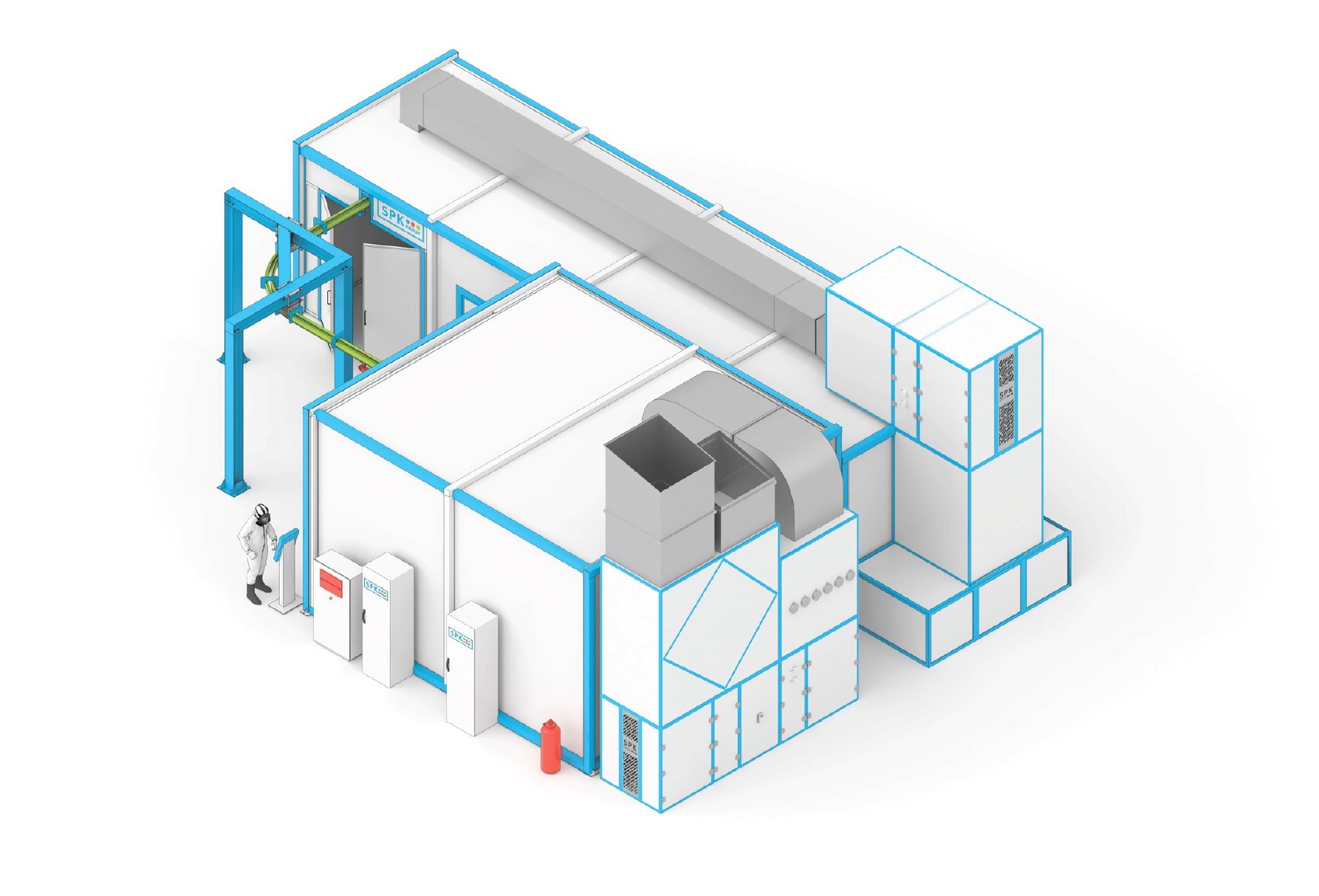 Этот участок предназначен для подготовки изделий к покраске, нанесения лакокрасочных покрытий и их последующей сушки при повышенной температуре. В камерах создается равномерный поток предварительно очищенного и подогретого воздуха, что обеспечивает высокое качество покрытия. Особенность окрашивающей камеры — сухая фильтрация воздуха, которая задерживает остатки краски и пыль, что способствует идеальному нанесению лакокрасочного слоя и исключает необходимость в дополнительных очистных системах.