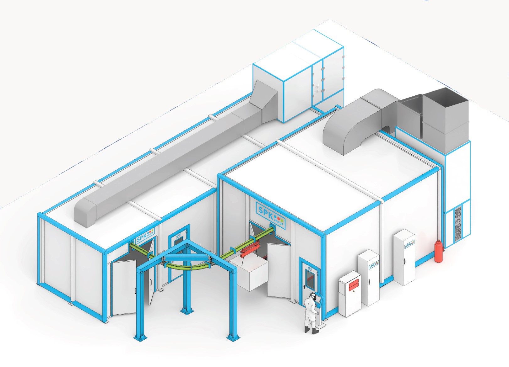 Оборудование участка окраски SPK включает проходные камеры: окрашивающую модель SPK-SB-6.5.3 и сушильную модель SPK-CB-12.3.3, а также ручной монорельсовый конвейер SPK-CS-28. Управление всеми системами осуществляется через современную автоматическую систему на базе программируемого логического контроллера с выносной сенсорной панелью для оператора.