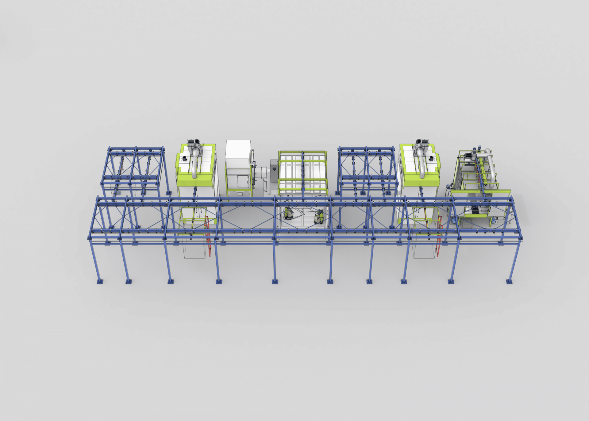 Общий технологический поток предусматривает последовательное выполнение операций по окраске на транспортной системе. После обработки изделия аккумулируются перед камерой полимеризации, проходят нагрев и полимеризацию в печи, далее выкатываются в зону охлаждения и выгрузки. Каретки транспортного оборудования оснащены системами фиксации рельс. Размеры транспортной подвесной системы уточняются в процессе проектирования и размещения оборудования.