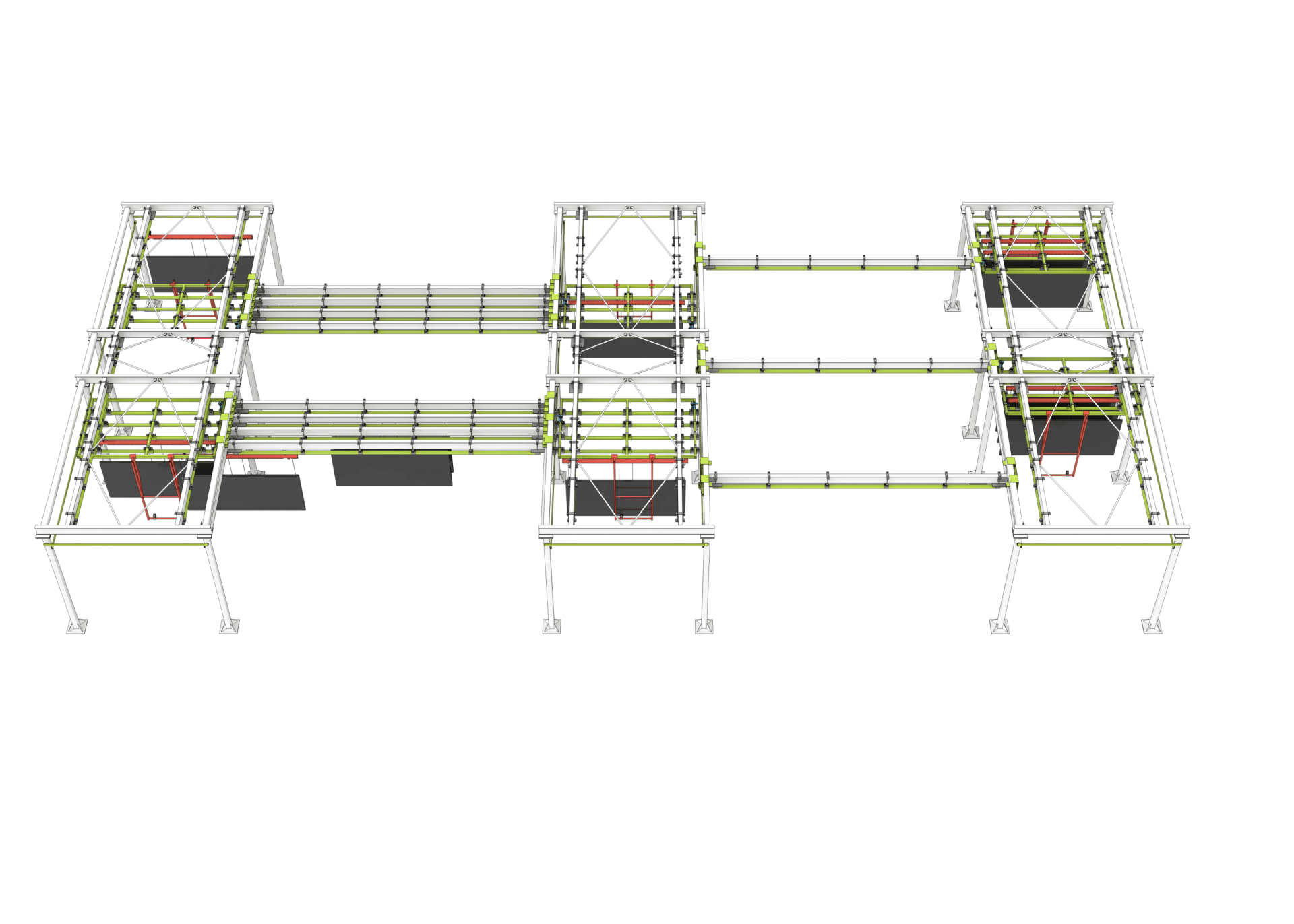Подвесная транспортная система — плоско-параллельный конвейер с ручным перемещением. Крепление изделий на траверсу и снятие происходит вручную операторами или с помощью кран-балки заказчика. Максимальная нагрузка на одну траверсу — до 300 кг.