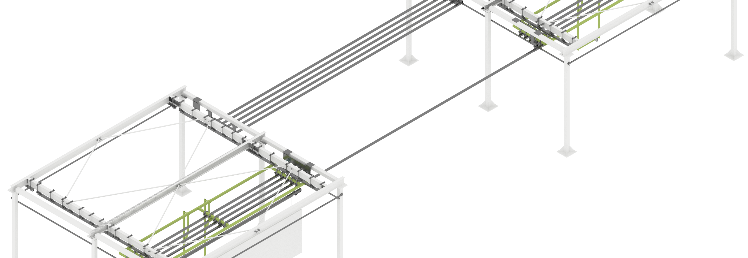 Перемещение изделий между камерами организовано с помощью ручной транспортировочной системы верхнего типа. В составить системы — 10 траверс, 2 каретки, максимальный вес конструкций на одной траверсе не может превышать 300 кг.