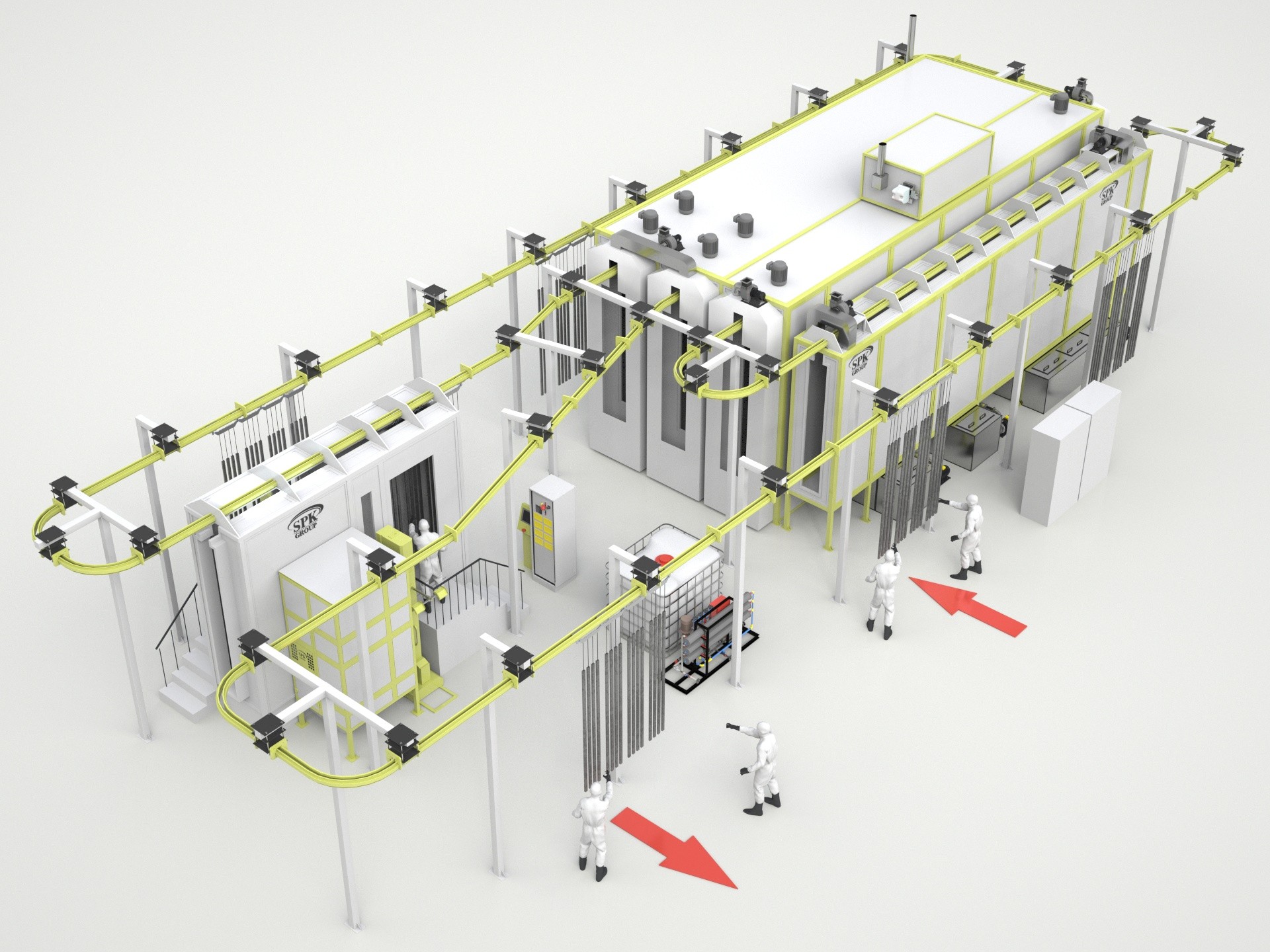 Для перемещений изделий между камерами без перевешивания и потери заземления установлен ручной конвейер верхнего типа с двумя каретками и двумя траверсами нагрузкой до 1000 кг.