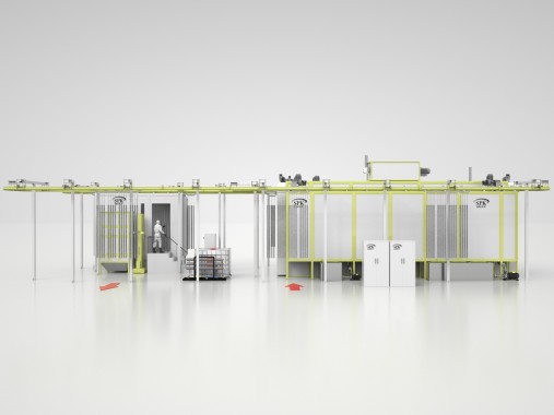 Нанесение порошковой краски происходит камере окрашивания — это картриджная металлическая камера с вентиляционной установкой на 16 000 м³/ч. Камера обитаемая, имеет транспортировочные проёмы, сервисные двери.