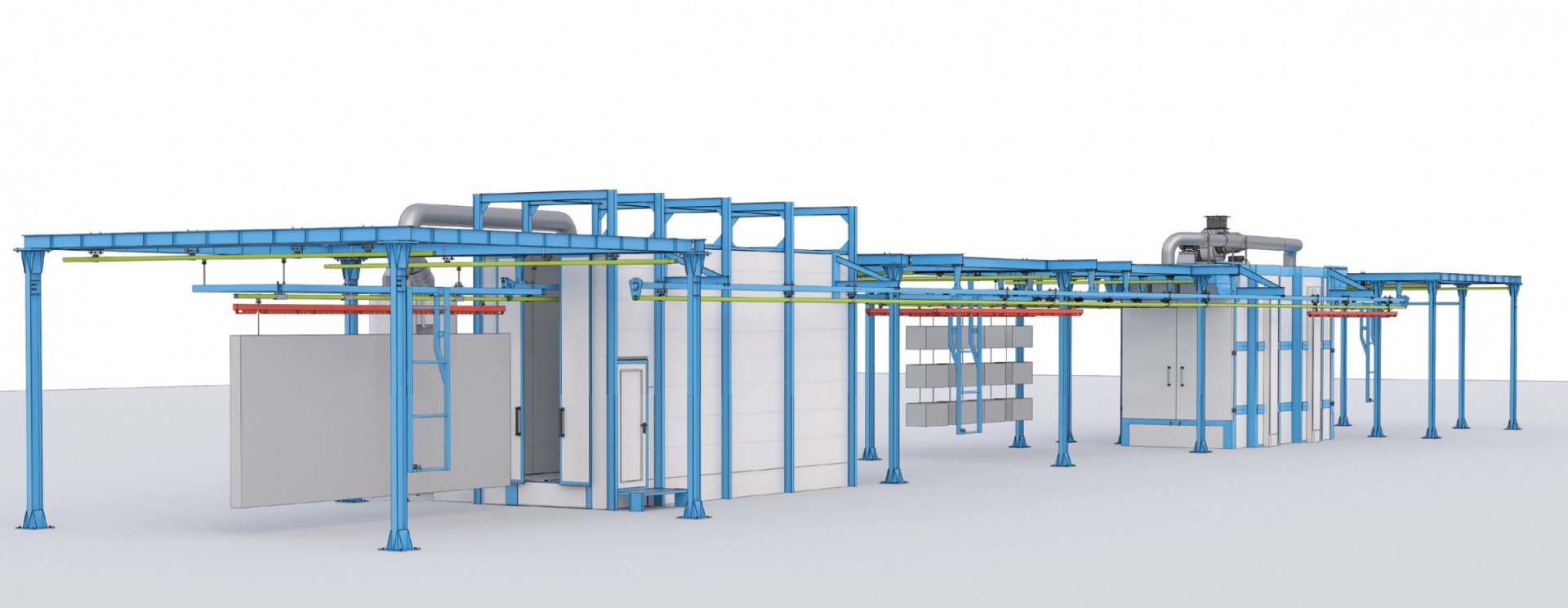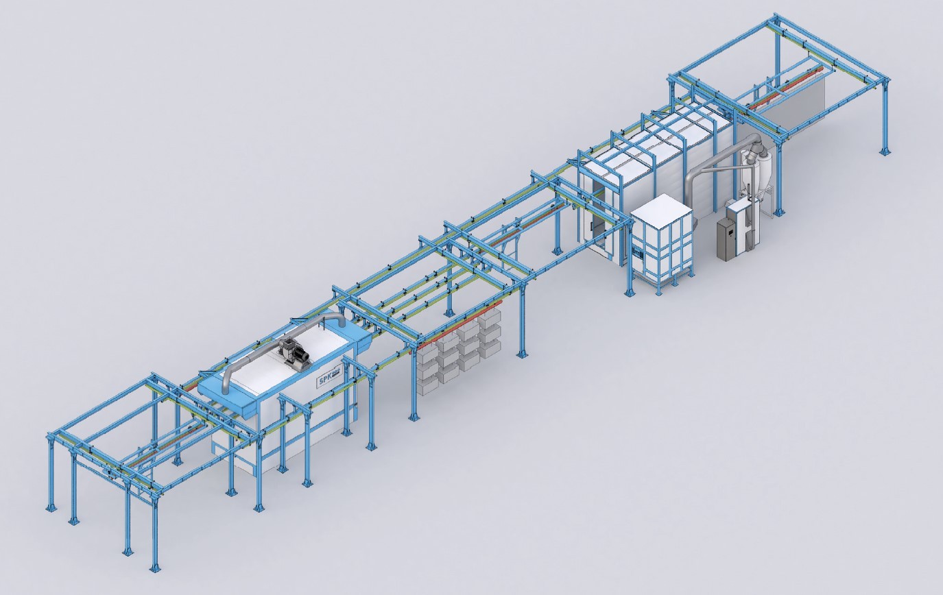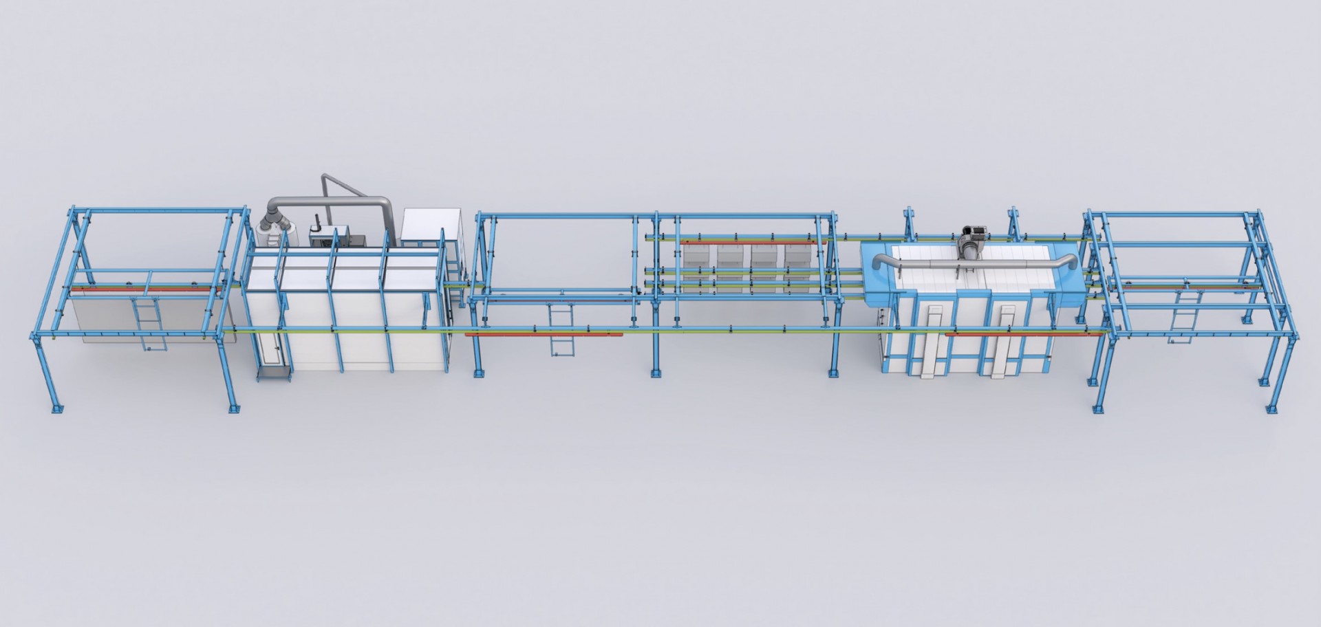 Двусторонняя камера нанесения порошкового покрытия (габариты — 7600 х 2600 х 4100 мм): предназначена для нанесения порошковой краски на изделия. Внутри камеры реализован сбор и переработка остатков неосевшей краски, что исключает их попадание в производственную зону и обеспечивает возврат порошка в цикл. Оснащена системой фильтрации и очистки воздуха, позволяющей возвращать очищенный воздух в помещение цеха.
