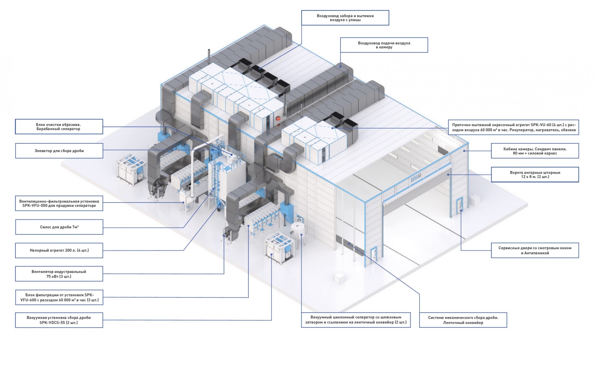 - Вакуумную систему сбора дроби SPK-VDCS‑55 для внутреннего сбора дроби из полостей судна: включает вакуумный насос мощностью 55 кВт со встроенными патронными фильтрами, циклонный сепаратор для отделения дроби на ленточном конвейере, вакуумную магистраль вдоль торцевой стены камеры с точками подключения гибких шлангов и вакуумные шланги со соплами.
