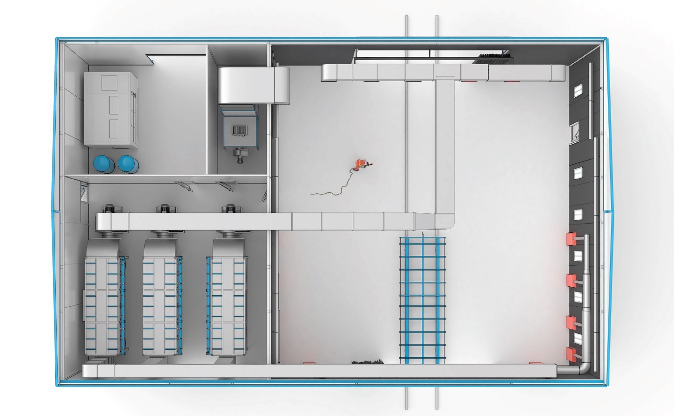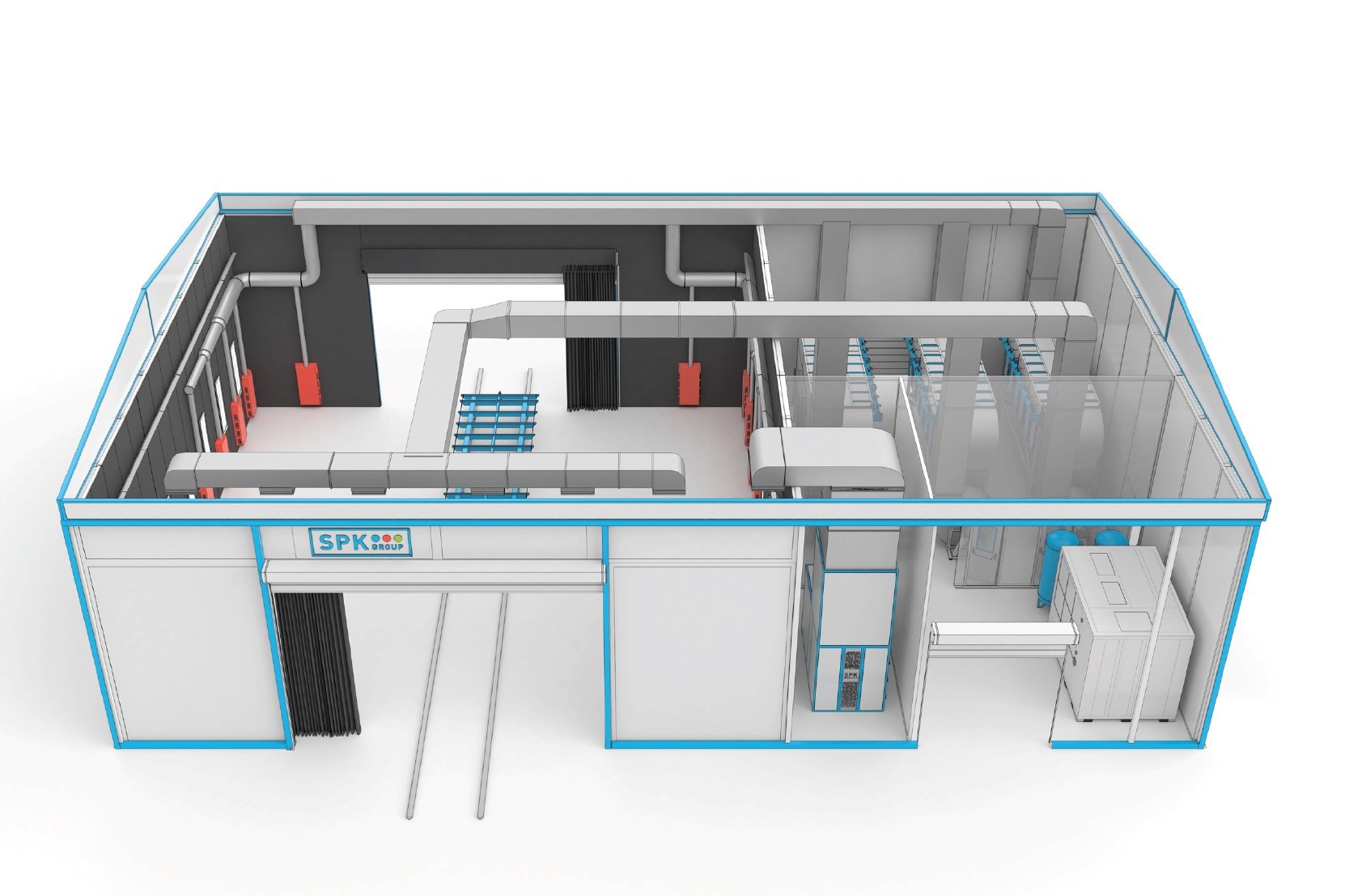 Конструкция дробеструйной камеры выполнена на металлокаркасе с навесом и включает резиновое покрытие для защиты стен от дроби. Оснащена двумя утепленными роллетными воротами размером 7000х5000 мм и двумя воротами размером 3000х3000 мм для обслуживания. В рабочей зоне установлены светильники со специальным укрепленным стеклом для защиты от дроби, обеспечивающие освещенность около 800 люкс — светодиодные модели. В системе также предусмотрены три вентиляционно-фильтровальные установки СПК-VFU-300 и электрический нагревательный агрегат СПК-VU-10. Управление осуществляется с помощью сенсорной панели.