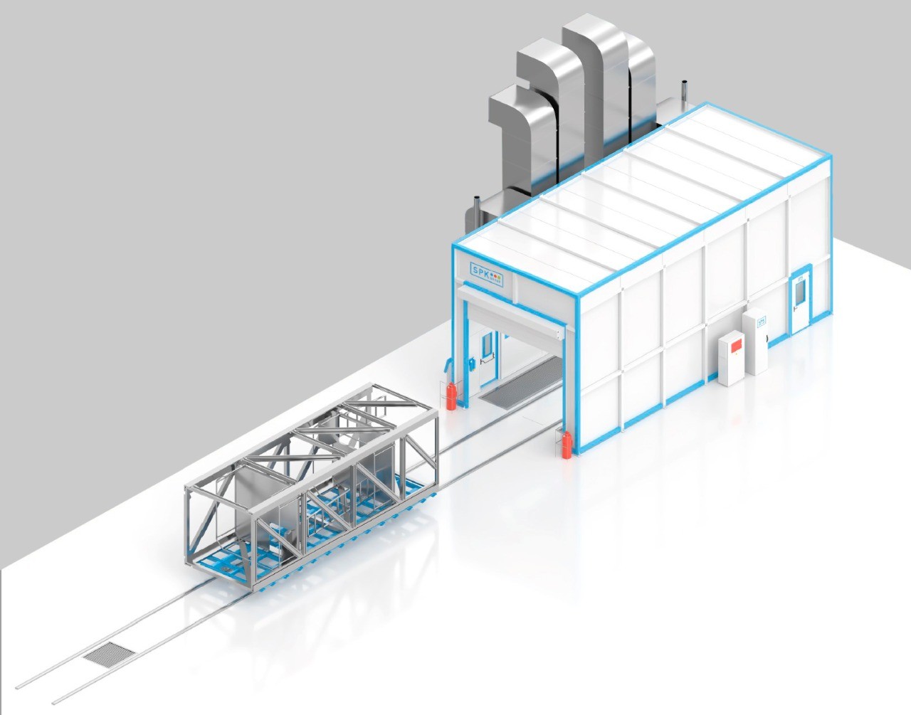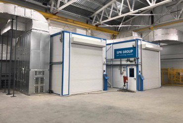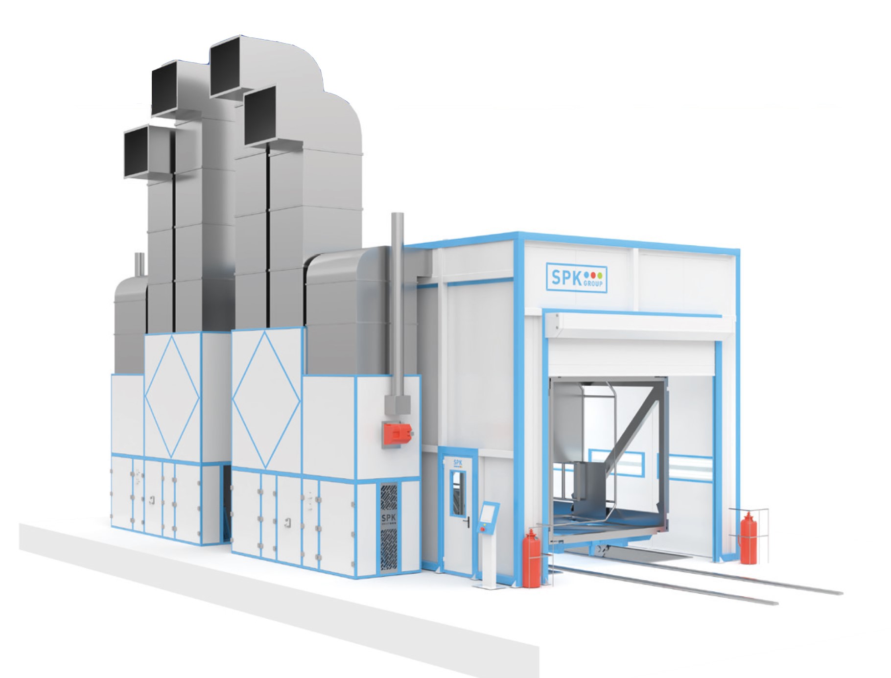 Окрасочно-сушильная камера тупикового типа SPK-SCB-12.5.5 (далее — ОСК) предназначена для подготовки изделий перед покраской, нанесения лакокрасочных покрытий и их высушивания при повышенной температуре. Внутри камеры обеспечивается равномерный поток предварительно подогретого и очищенного воздуха. Направление воздушного потока — сверху вниз. Камера использует сухую фильтрацию воздуха от остатков краски, что гарантирует качественное нанесение лакокрасочных материалов и исключает необходимость дополнительных очистных систем.