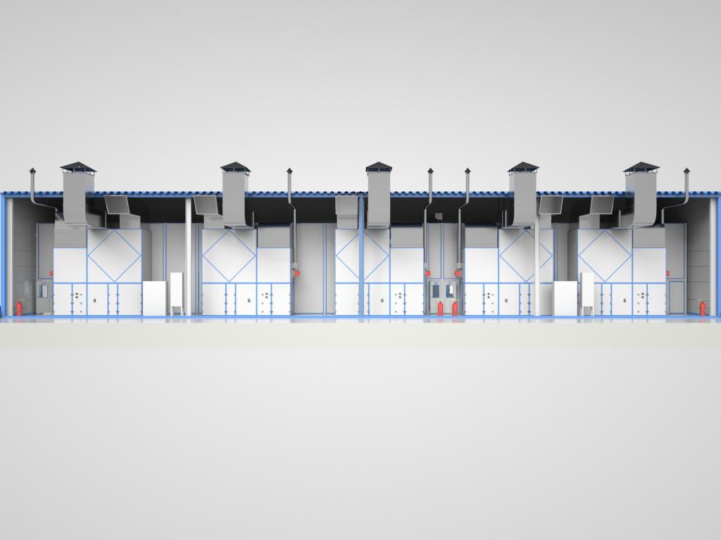 Вытяжка воздуха в камере производится через 2 канала, расположенных в полу кабины. Для нагрева воздуха применяются теплообменники с дизельной горелкой. Вертикальный нисходящий поток воздуха. 2-секционная кабина окрасочно-сушильной камеры SPK внутреннего исполнения. Габариты камеры внутри: 40000х6000х5600 мм. Ворота роллетные утепленные с электроприводом для тамбура 5000х5000 мм. Предусмотрены роллетные ворота для разделения секций. Сервисная дверь для персонала.