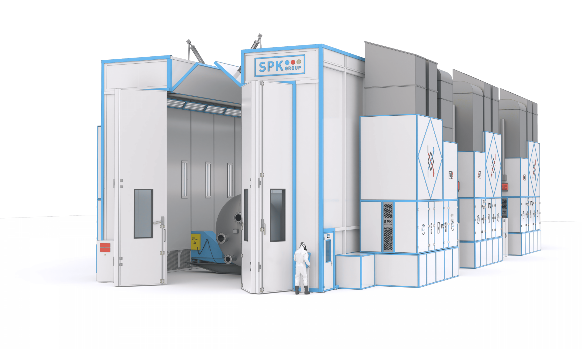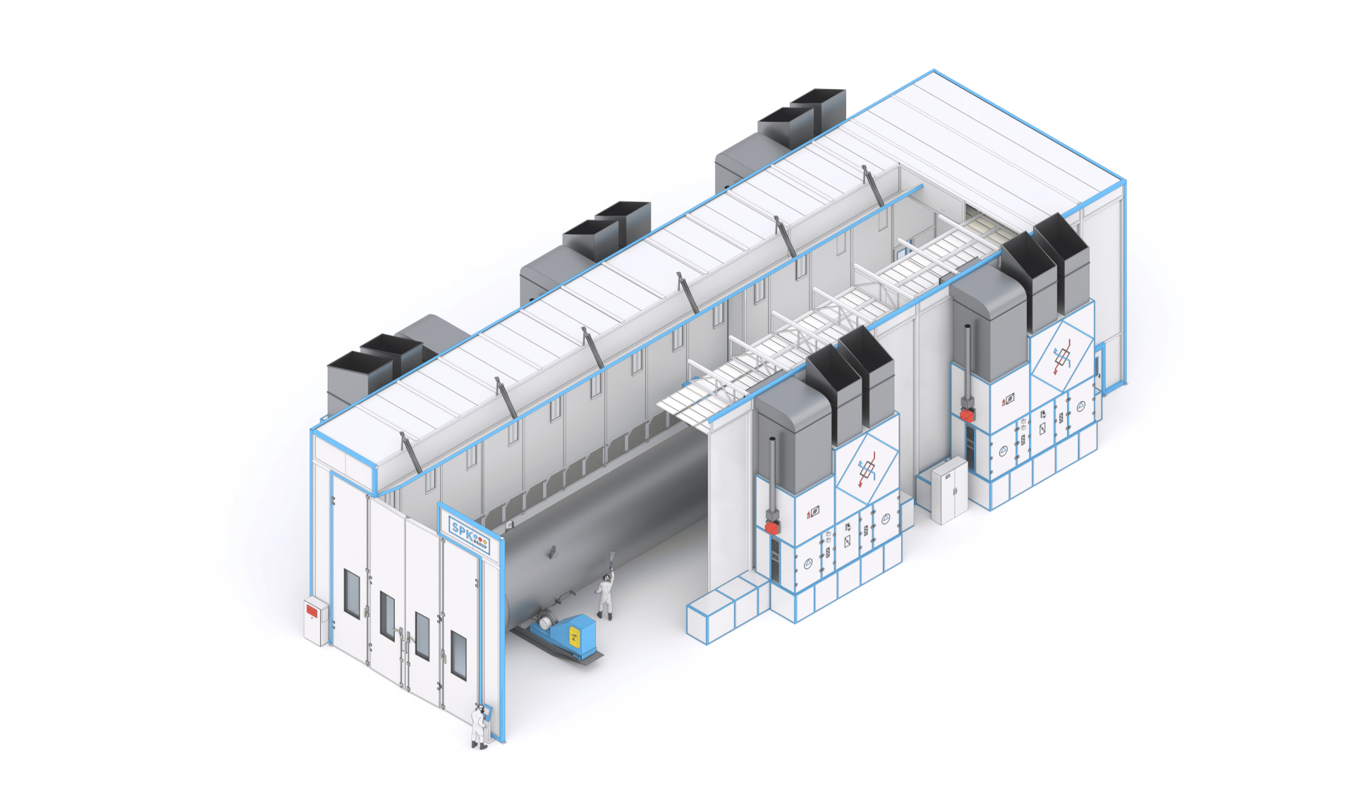 Окрасочно-сушильная камера тупикового типа SPK-SCB-20.5.4 (далее — ОСК) специально разработана для подготовки изделий перед окраской, нанесения лакокрасочных слоёв и их последующего высушивания при повышенных температурах. Внутри камеры обеспечивается равномерный приток очищенного, подогретого воздуха с движением сверху вниз. ОСК использует сухую систему фильтрации воздуха от остатков краски, что способствует качественному нанесению лакокрасочного слоя и исключает необходимость в установке дополнительных очистных систем.