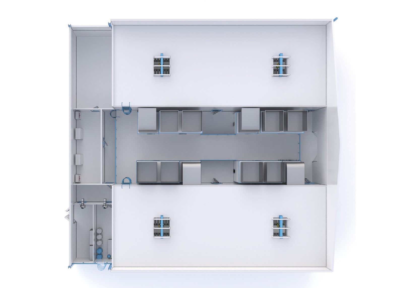 Внутренние размеры каждой секции камеры составляют 21 000 мм в длину, 8 000 мм в ширину и 6 000 мм в высоту, что обеспечивает возможность размещения крупных изделий или нескольких меньших одновременно, гарантируя равномерное покрытие и качественную сушку. Эта камера идеально подходит для эксплуатации в уличных условиях и предназначена для использования в производственных линиях, требующих надежной защиты от внешних факторов при выполнении процессов окраски и сушки изделий.