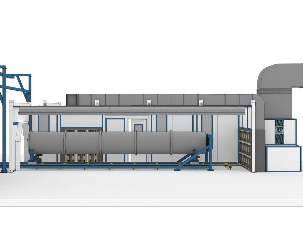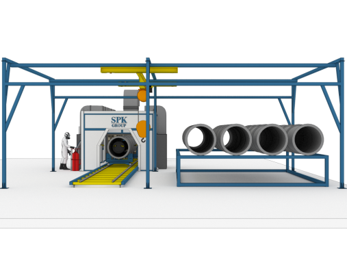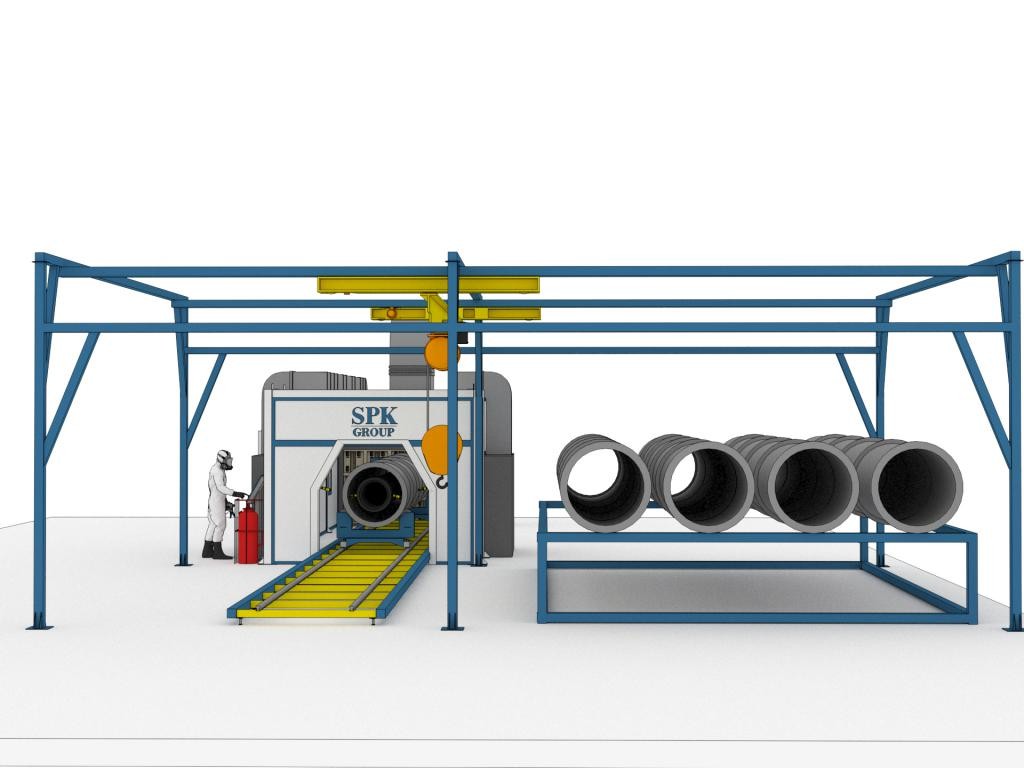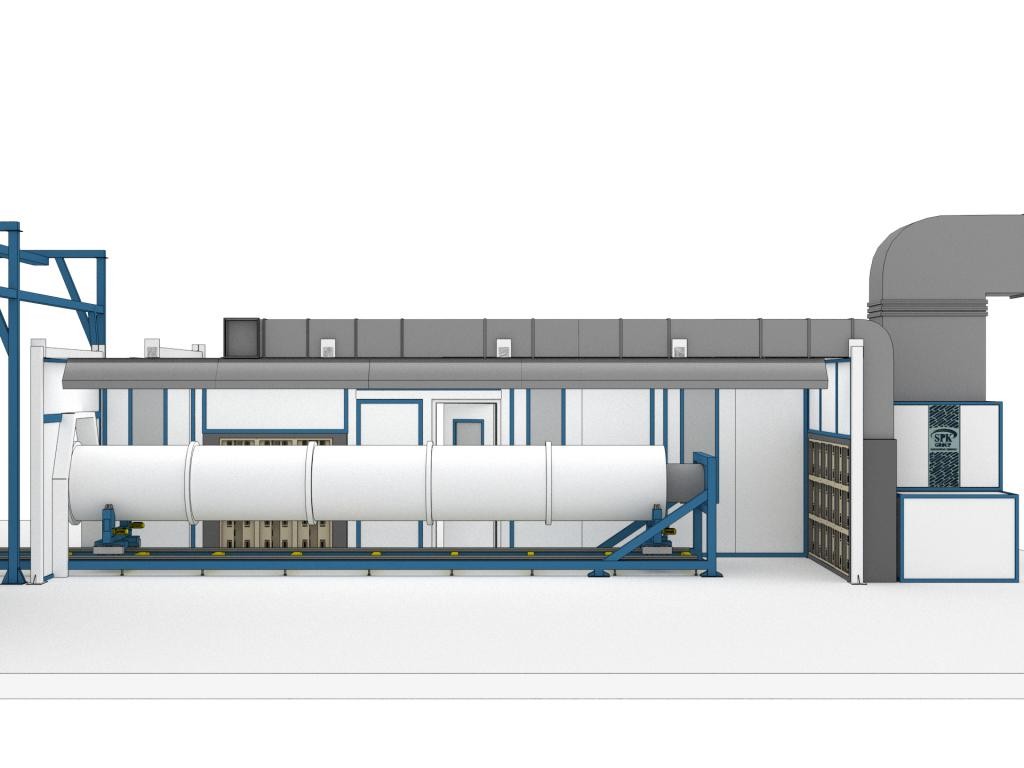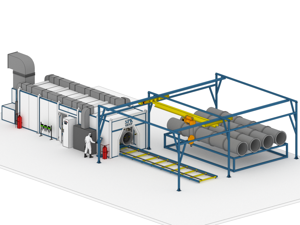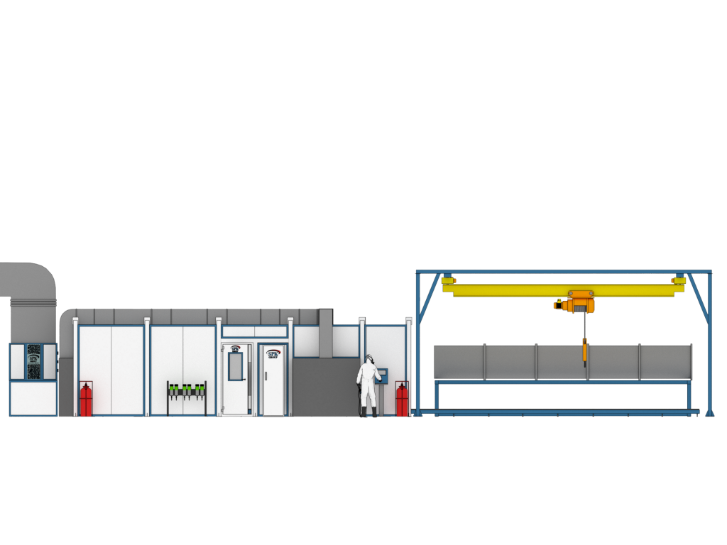 Тупиковая автоматическая окрасочная камера SPK-SB-9.3.2 предназначается для подготовки изделий к окраске (нанесение обезжиривателя), нанесения на изделия ЛКМ. В окрасочной камере создается воздушный поток, направленный равномерно по диагонали. Способ фильтрации воздуха от остатков краски – сухой.