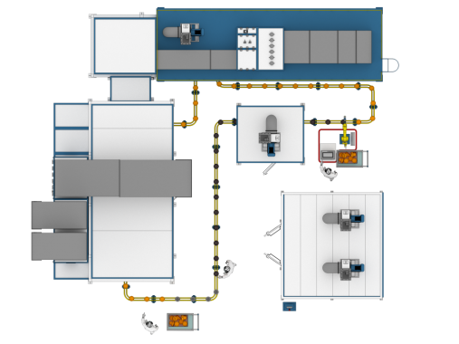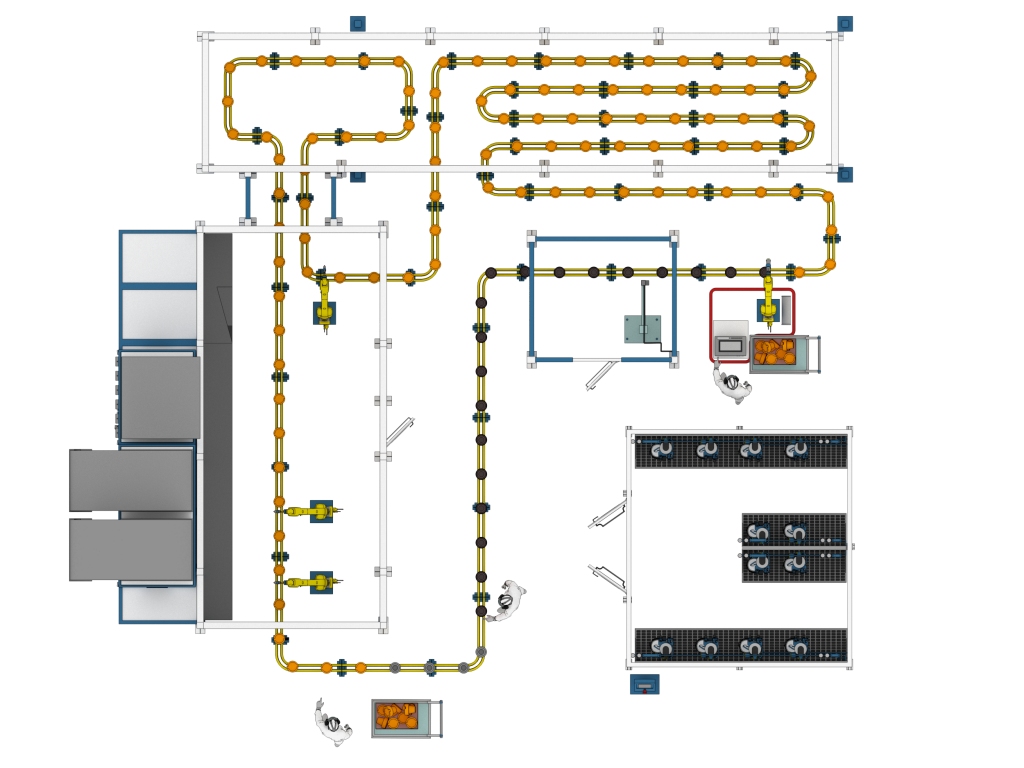 Изделия крепятся на модулях тактового конвейера на расстоянии 600 мм. Одна точка крепления предназначена для изделий весом до 50 кг. Напольный конвейер длиной 71,5 метра двигается с тактовой частотой 10 — 15 секунд. Для лучшего нанесения краски в зоне окрашивания изделия могут вращаться.