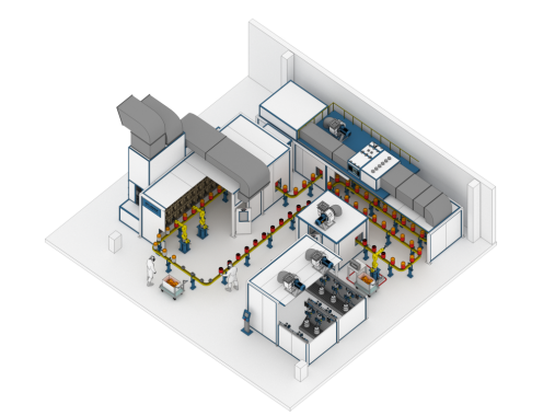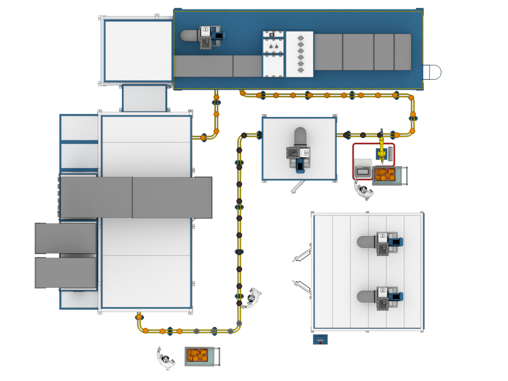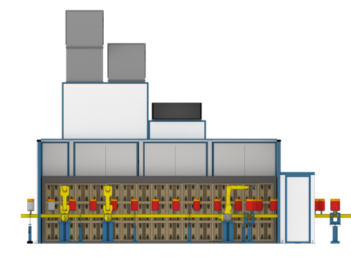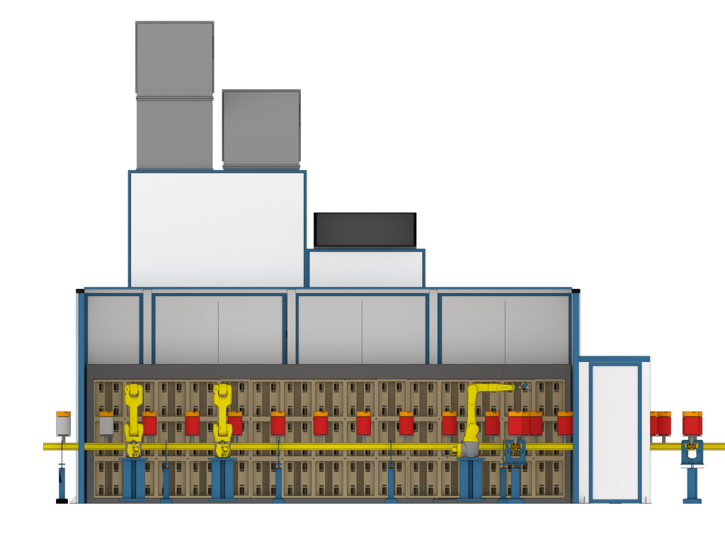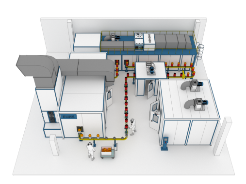 - Камера окрашивания. Участок нанесения идентификационного слоя краски. Установлены 2 роботизированных устройства окрашивания и 2 рабочих места операторов — маляров.