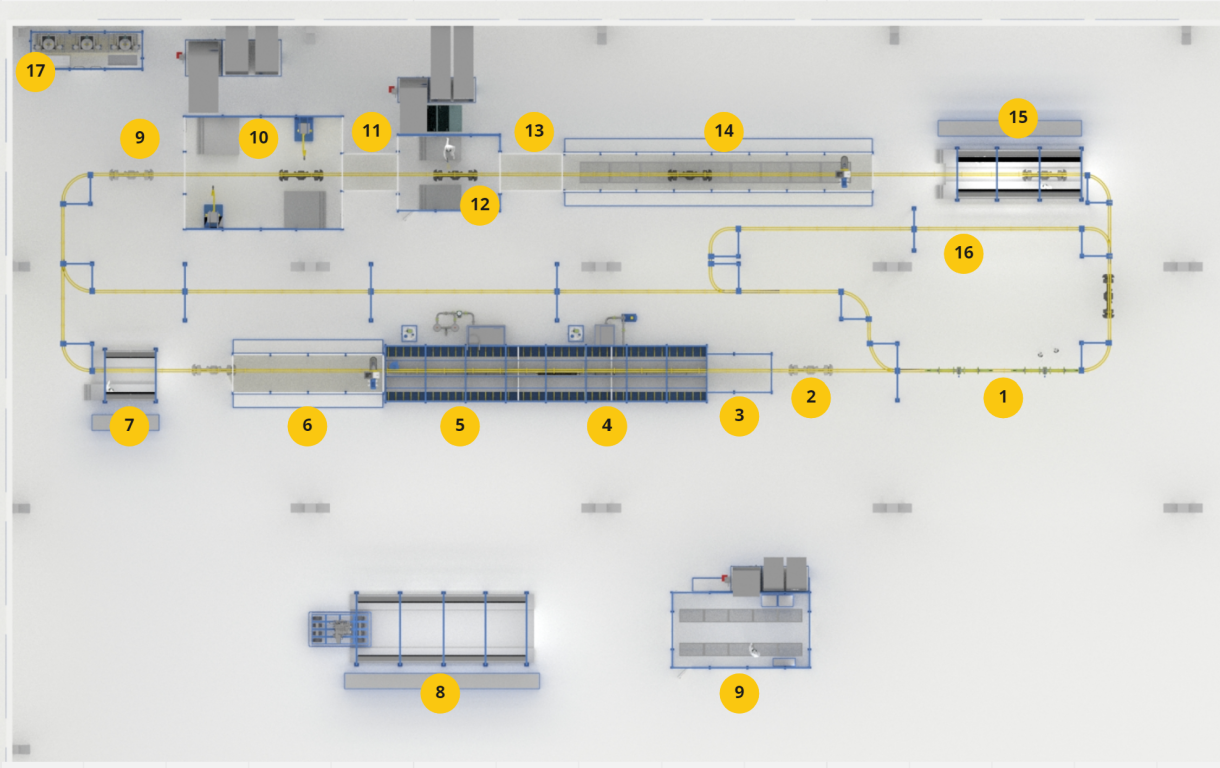 Для данной линии выбран конвейер Power&Free с подвесными модулями, изделия передвигаются по конвейеру со скоростью 6-8 м/мин.
