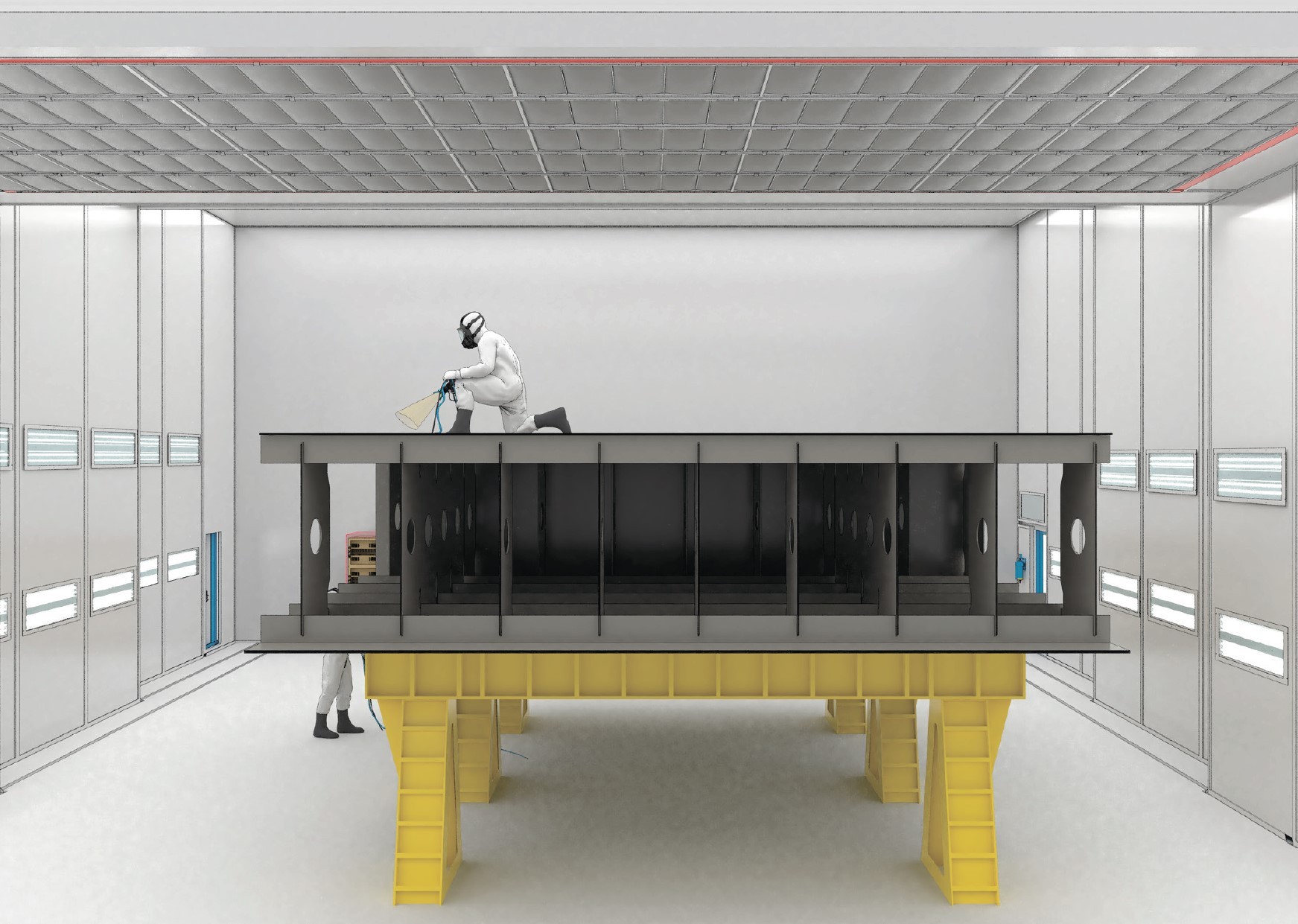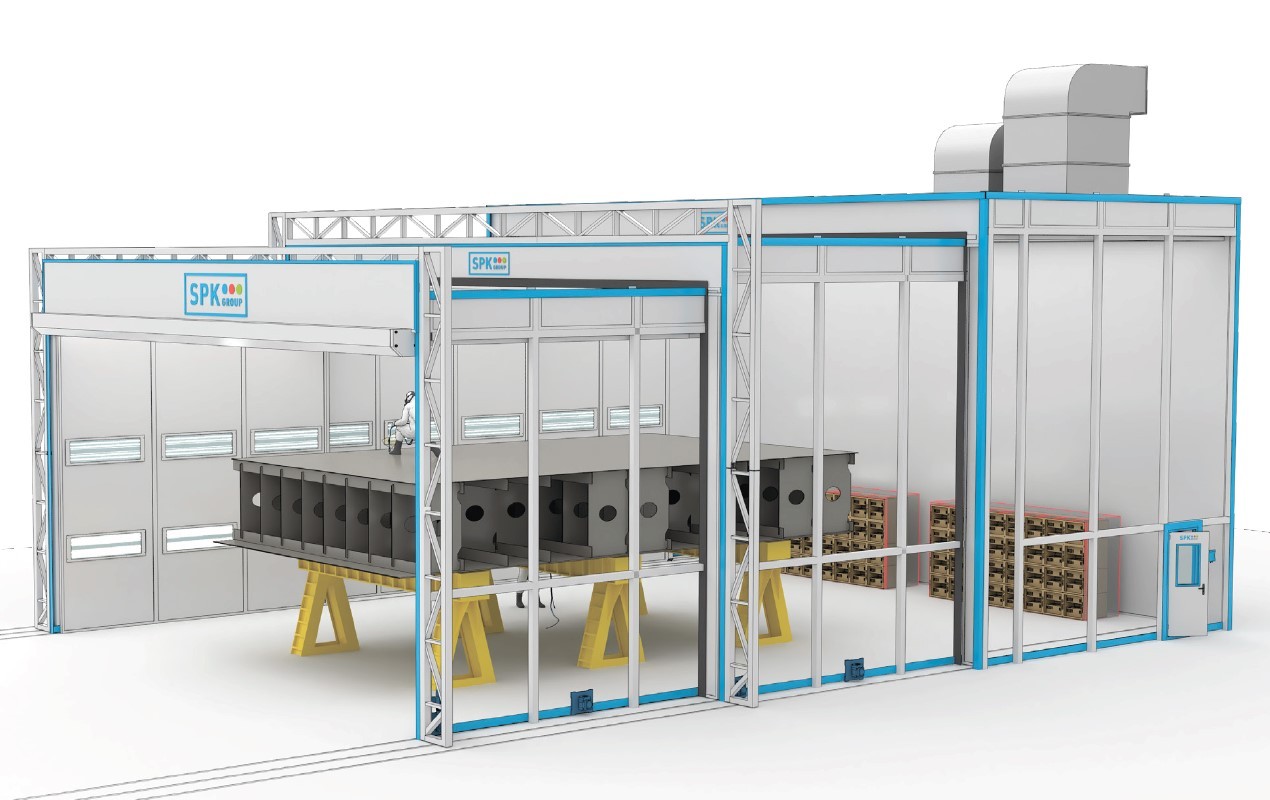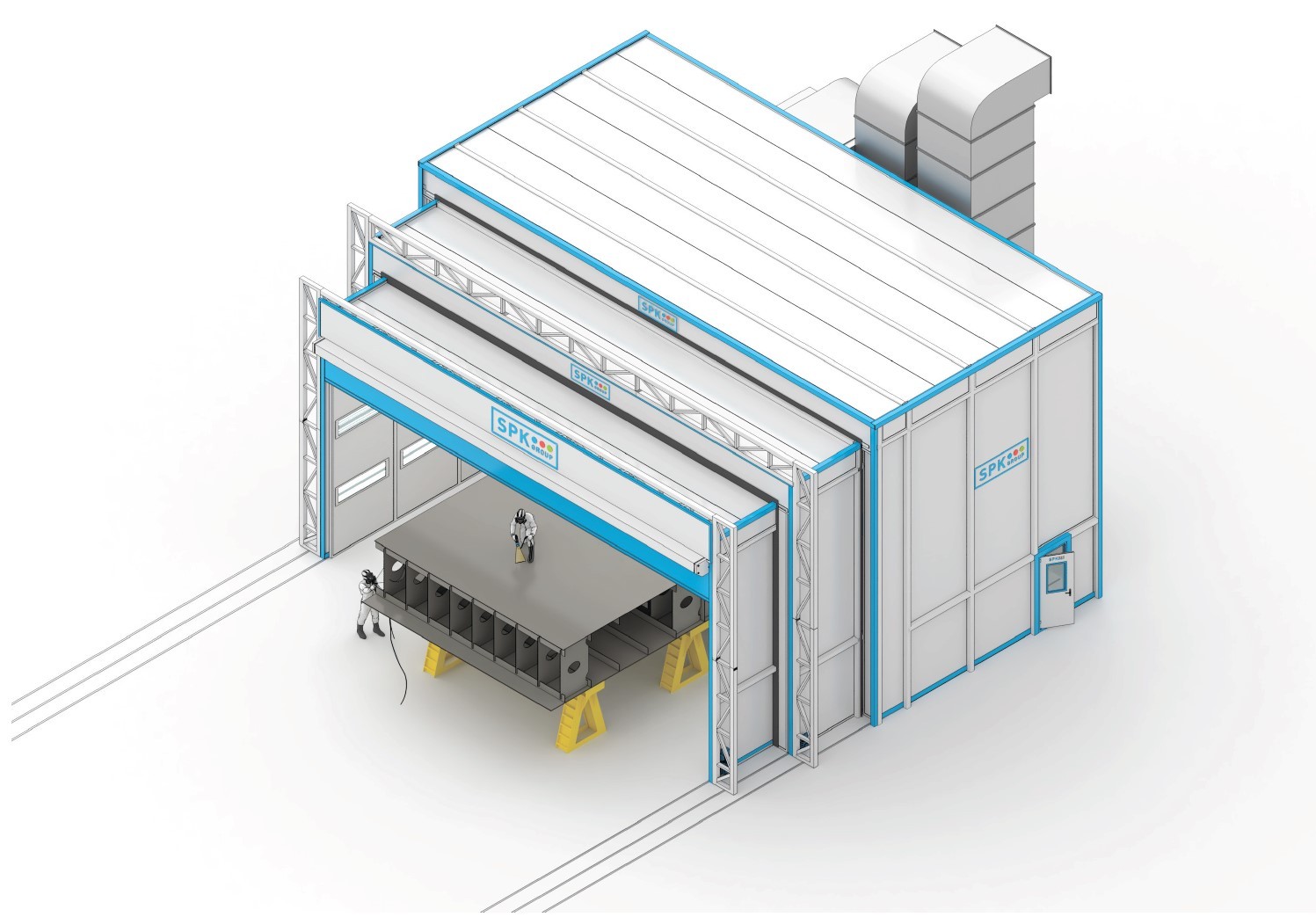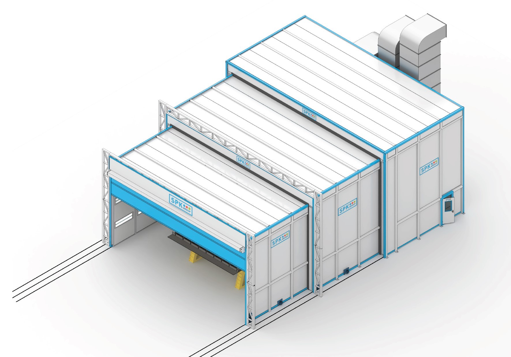 Окрасочно-сушильная телескопическая камера СПК-СCB(Fx)-19.12.8 (далее — ОСК) предназначена для подготовки изделий к покраске, нанесения лакокрасочных покрытий и их последующей сушки при температуре 40…50°C. Конструкция камеры включает три секции: одну стационарную и две мобильные, которые перемещаются по рельсовому пути с помощью моторредукторов. Рельсы выполнены из прутка квадратного сечения примерно 80х80 мм и установлены вровень с нулевой отметкой. Все три секции могут складываться в компактное положение, что обеспечивает беспрепятственный внутрицеховой логистический процесс.