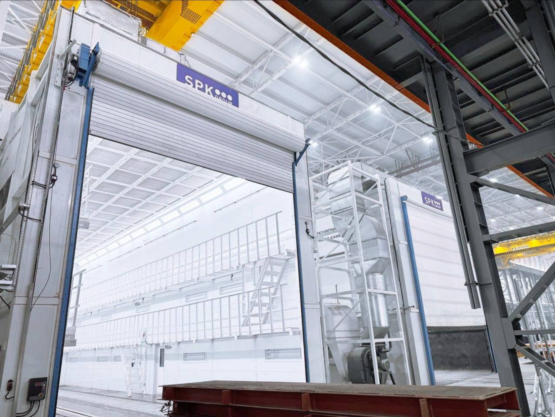 Сегодня речь пойдёт о двухсекционной проходной окрасочно-сушильной камере, предназначенной для высококачественного нанесения лакокрасочных покрытий и их эффективной сушки. В камере установлена продуманная система фильтрации вытяжного воздуха, включающая напольные лабиринтные фильтры, механическую очистку и стекловолоконные фильтры с функцией задержки красочных частиц. Это позволяет надёжно улавливать остатки краски, защищать окружающую среду и продлевать срок эксплуатации вентиляционного оборудования. Для обеспечения необходимого воздухообмена работают четыре вентиляторных агрегата с производительностью по 50 000 м³/ч каждый. Такая мощность обеспечивает интенсивную циркуляцию воздуха, равномерное распределение температуры и оперативное удаление паров растворителей, что особенно важно при обработке крупных и объемных изделий. Для повышения комфорта и безопасности работы персонала внутри камеры смонтированы стационарные галереи и лифт-площадки, которые позволяют удобно выполнять задачи на разных высотах.
