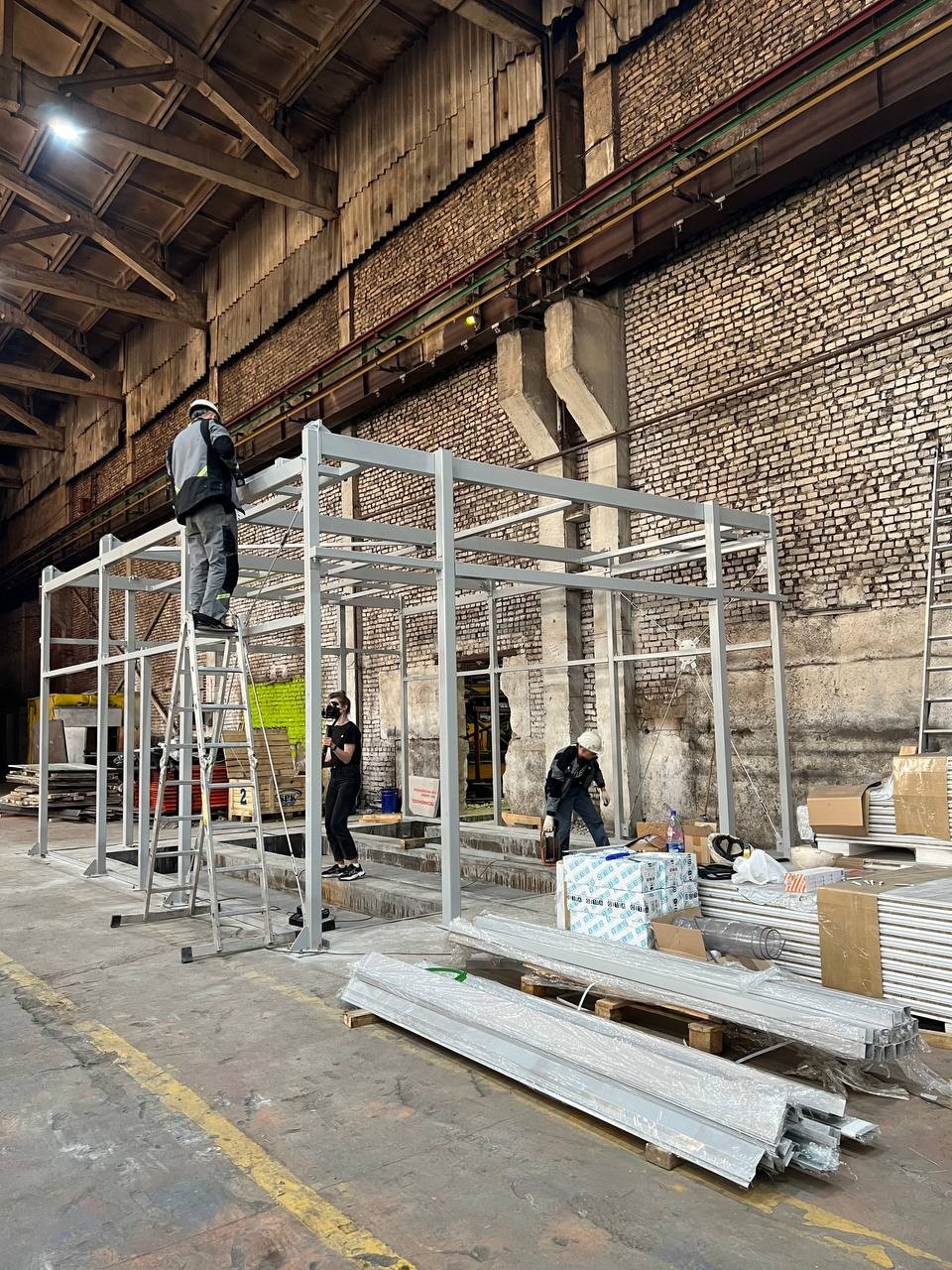Обитаемая проходная камера дробеструйной обработки с габаритами 6.800х5.000х3.200 мм. Предназначена для обработки металлоконструкций размерами 2.000х1.500х1.500 мм, вес – 500 кг. Площадь обрабатываемой поверхности одного изделия – 16,5 м2. Используемый абразив – дробь. Металлокаркас дробеструйной камеры с порошковым покрытием. Роллетные ворота ПВХ 3.000х2.500 мм. Дверь сервисная дверь 800х2000 мм. На потолке и стенах имеется резиновое покрытие для защиты от дроби. Предусмотрена система светодиодного освещения. Напольный поперечный и продольный конвейеры (Италия). Силос для дроби. Резервуар напорный на одного оператора на 200 литров. Вытяжная отбойная перегородка.