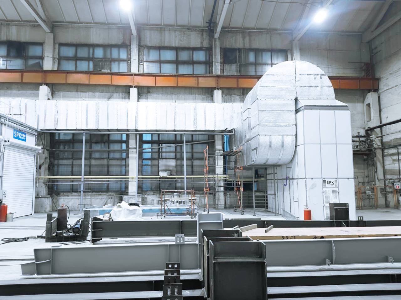 Особое внимание уделено оригинальному размещению вентиляционного оборудования: в условиях ограниченного пространства приточно-вытяжной агрегат был установлен в необычном для него месте — на удалении от камер. Это решение позволило эффективно использовать цеховое пространство и облегчить проведение такелажных работ.