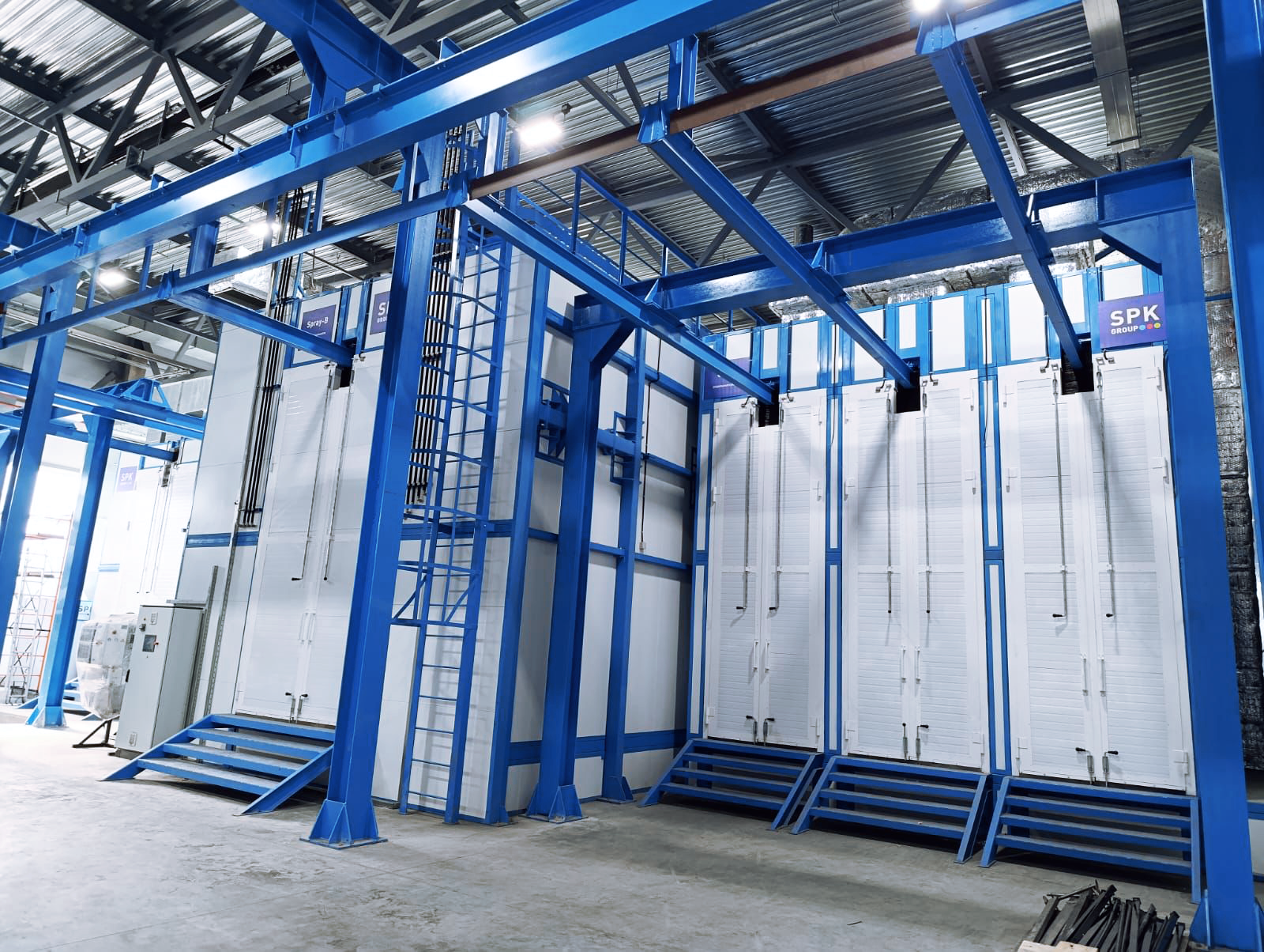 С помощью конвейера в единый комплекс соединены дробеструйная камера на 2 оператора, окрасочная камера с перспективной модернизацией роботами, трехсекционная сушильная камера. Дополнительно предусмотрено красокприготовительное отделение, а также оборудование для смешивания и подачи краски.
