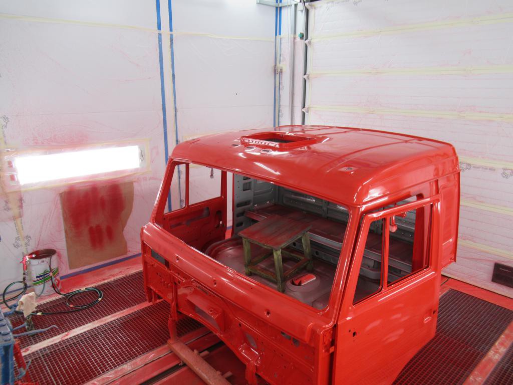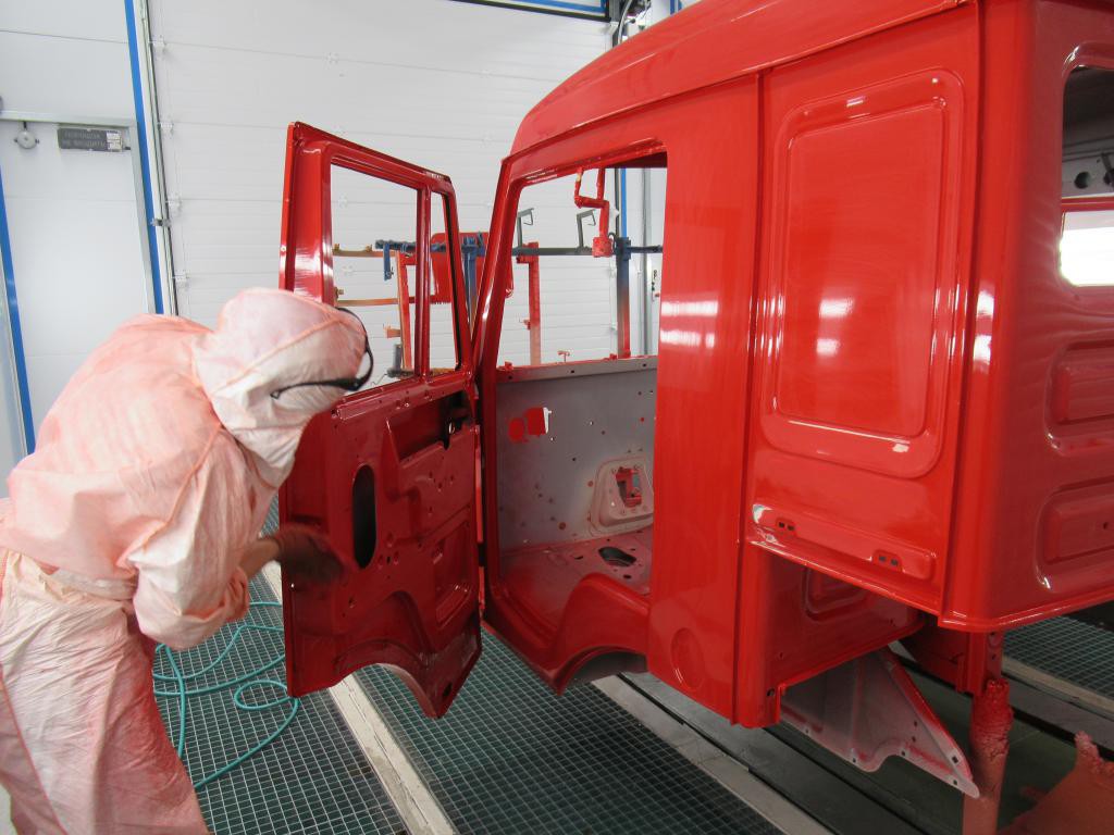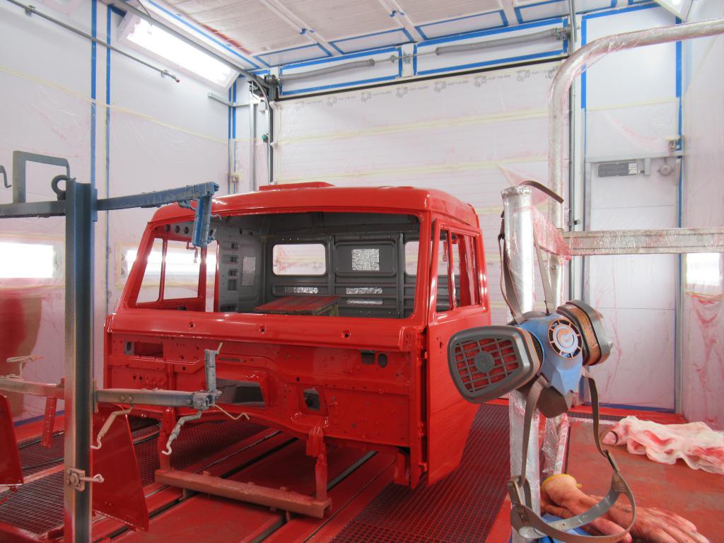 Линия подготовки и окраски кабин состоит из напольной транспортной системы типа СКИД, с тремя камерами — шлифовки, окраски и сушки.