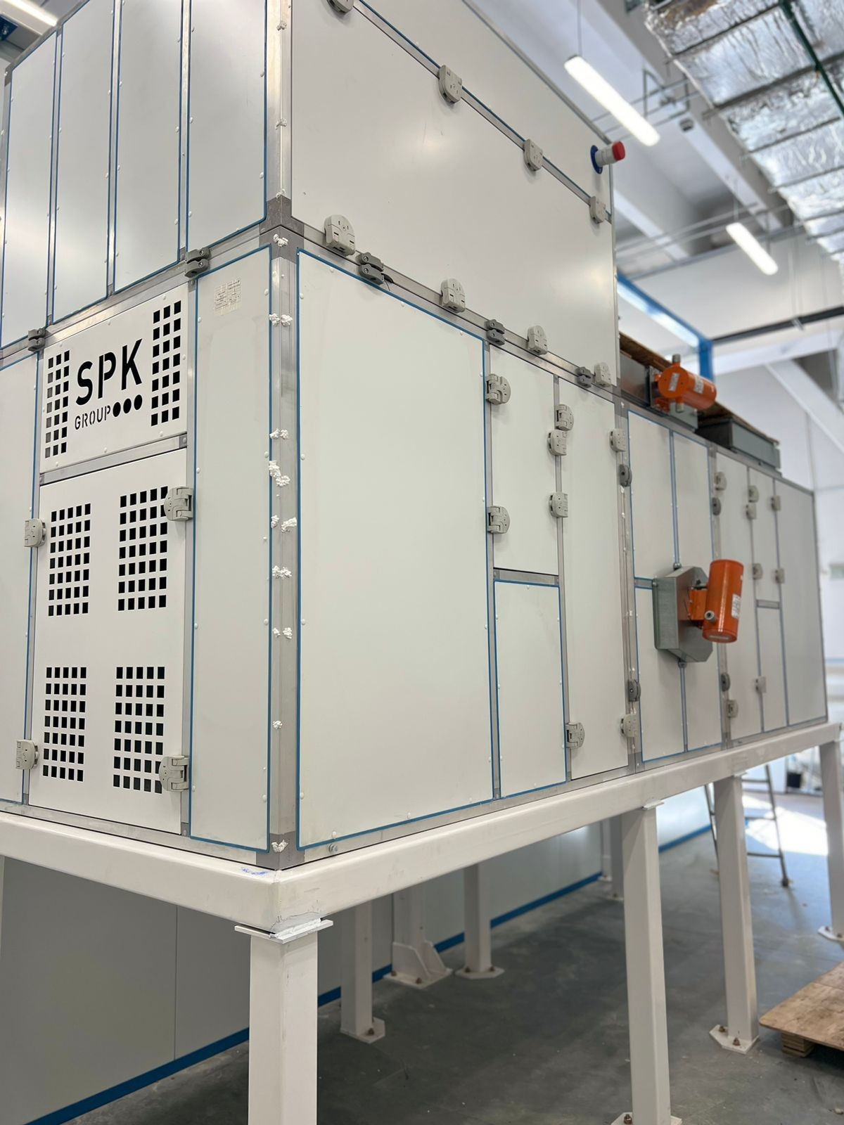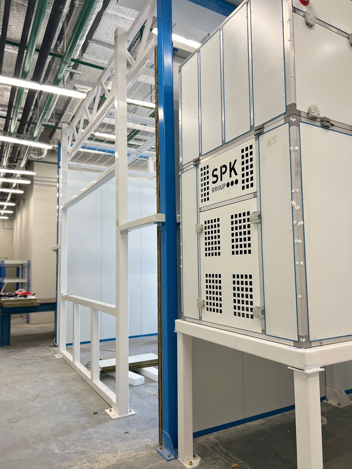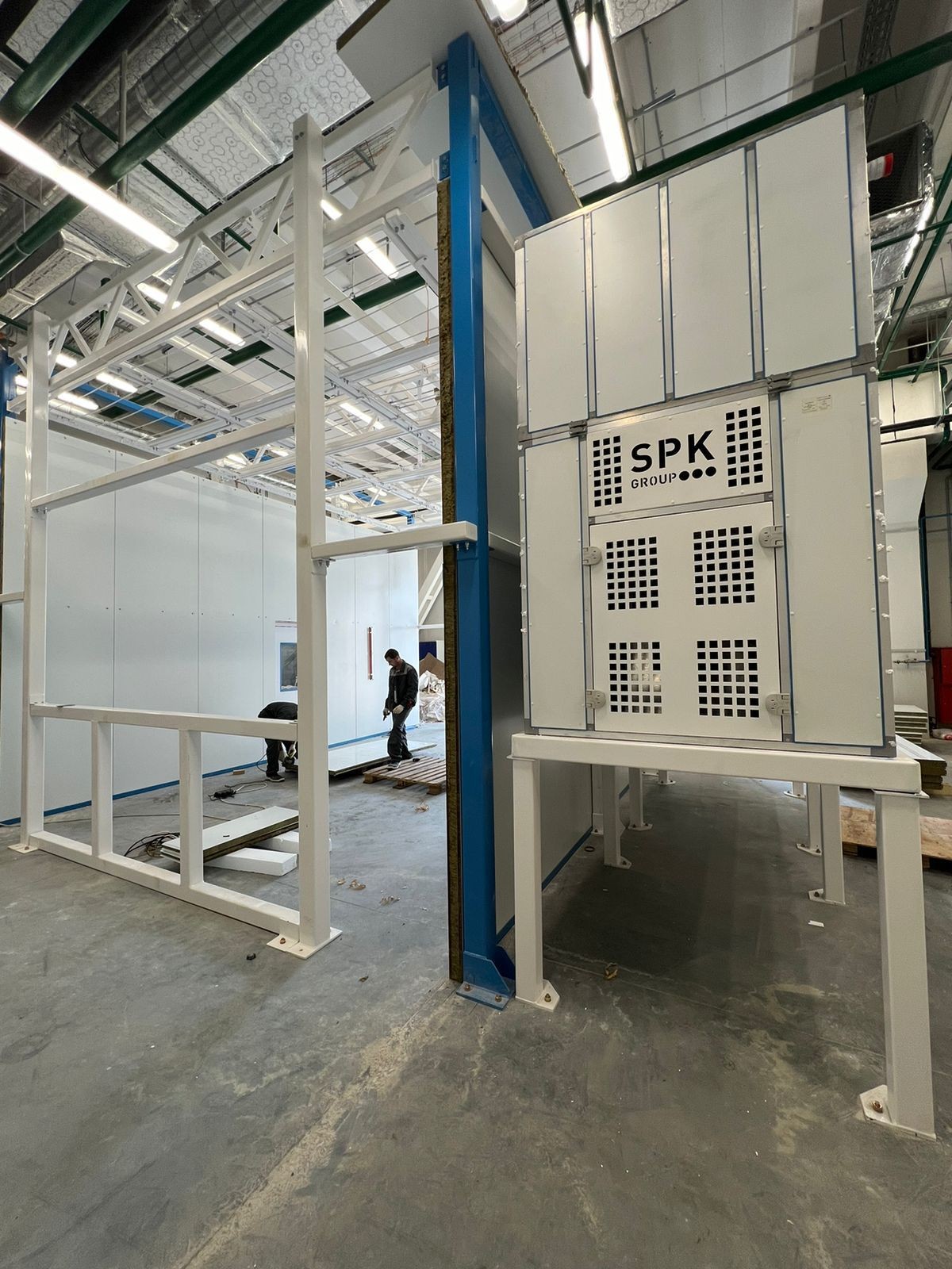 Металлокаркас ОСК с порошковым покрытием, облицованный сэндвич-панелями толщиной 50 мм. Основные ворота — ПВХ-роллетные, размеры 3000 х 3000 мм. В комплект входит сервисная дверь с доводчиком, размером 800 х 2000 мм. Освещение реализовано с помощью верхних и боковых светодиодных светильников. Установлены аварийные световые индикаторы: «Выход» и «Автоматика не работает». Внутри смонтированы потолочный тонкий фильтр и стекловолоконный краскоостанавливающий фильтр с классом очистки GЗ. Вентиляционная система включает взрывозащищённый агрегат SPK-VU-15 с расходом воздуха 15 000 м³/ч, водяной медно-алюминиевый теплообменник и гидравлический водосмесительный узел с регулирующей и отсекающей гидравликой. В системе установлен утеплённый морозостойкий воздушный отсекательный клапан и комплект автоматики. Управление осуществляется через программируемый логический контроллер. Предусмотрены точки быстрого подключения сжатого воздуха с фильтрацией и осушением. Для пожаротушения применяется порошковая автоматическая система.
