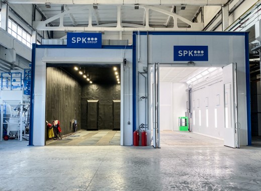 SPK — линия окрашивания установлена на территории заказчика. SPK — линия предназначена для очистки поверхности вездеходов, окрашивания и сушки нанесённой краски. В составе линии - камера дробеструйной очистки SPK-SBB-15.5.5, камера окрашивания и сушки SPK-SCB-13.6.5. Также в комплекте площадки пневматического типа для доступа операторов к поверхности вездеходов сверху и сбоку.