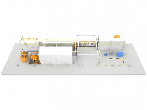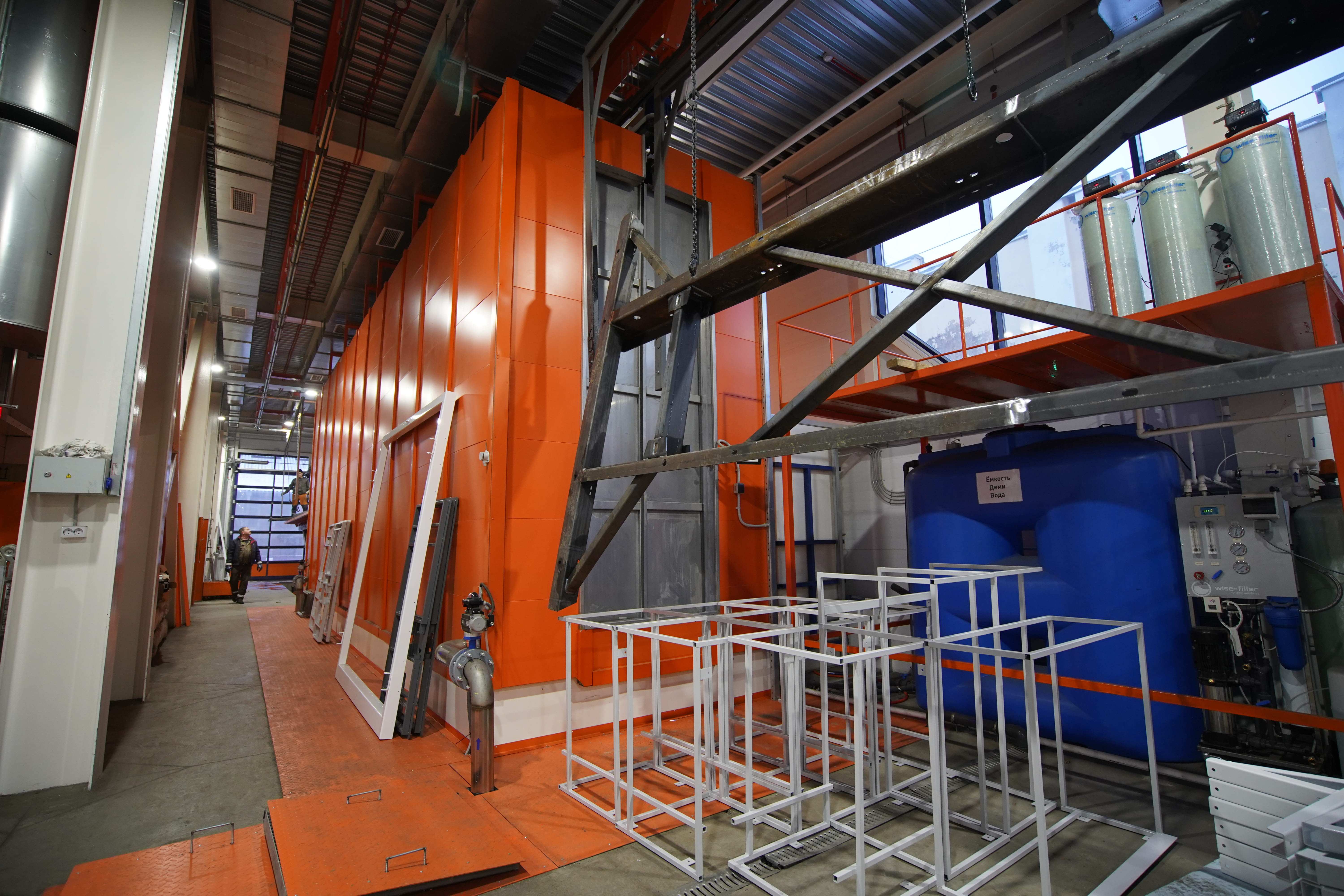 - Камеру обезжиривания и фосфатирования автоматическую. Внутренние габариты – 10х2х5 м. Назначение камеры – автоматическая обработки изделий химическими реагентами при помощи струйного облива. Воздухообмен для вытяжки – 1.600 м3/ч. Все вентиляционное оборудование выполнено в коррозионностойком исполнении. Моющий раствор нагревается при использовании природного газа. Мощность тепловая составляет 200 кВт. Максимальная температура сушки – 140 градусов. Предусматриваются автоматические сдвижные ворота. Тупиковое исполнение камеры. Внутренняя поверхность стен выполнена из нержавеющей стали. Наполнитель стен – PIR. Конструкцией камеры предусмотрены: стационарный контур облива изделий со 196 форсунками, система автоматического дозирования моющих и фосфатирующих реагентов с постоянным контролем Ph, маслоотделитель, нагрев моющего раствора, а также установку для деминерализованной воды, трехстадийную систему подачи слива стоков.