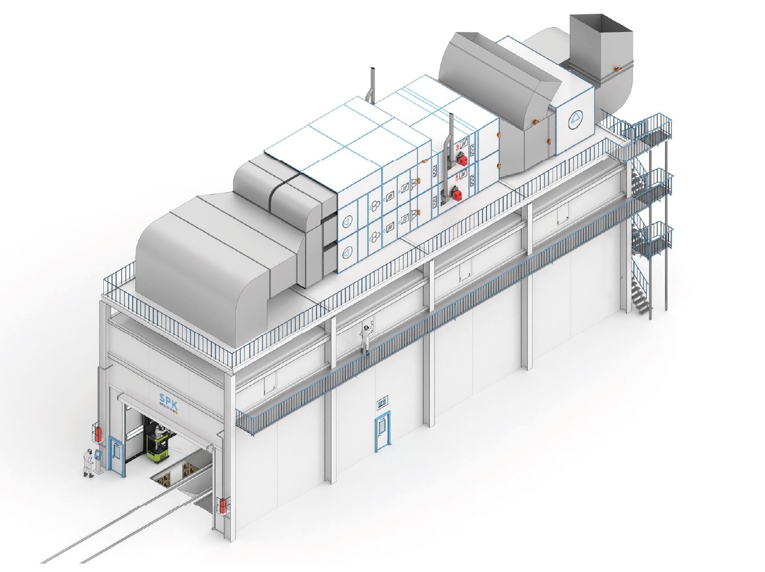 В систему вентиляции входит приточно-вытяжной агрегат SPK-VU-160 с расходом воздуха до 160 000 м³/ч, который поддерживает необходимые параметры температуры и влажности в холодный и жаркий периоды года. Агрегат оснащен газовым нагревателем, увлажнителем (сотовым или форсуночным), охладителем (чиллером), а также блоками приточного и вытяжного воздуха, рециркуляции и обводными каналами для режима сушки. Все вентиляторы оборудованы частотными преобразователями для защиты от перегрузок и регулировки разряжения внутри камеры.